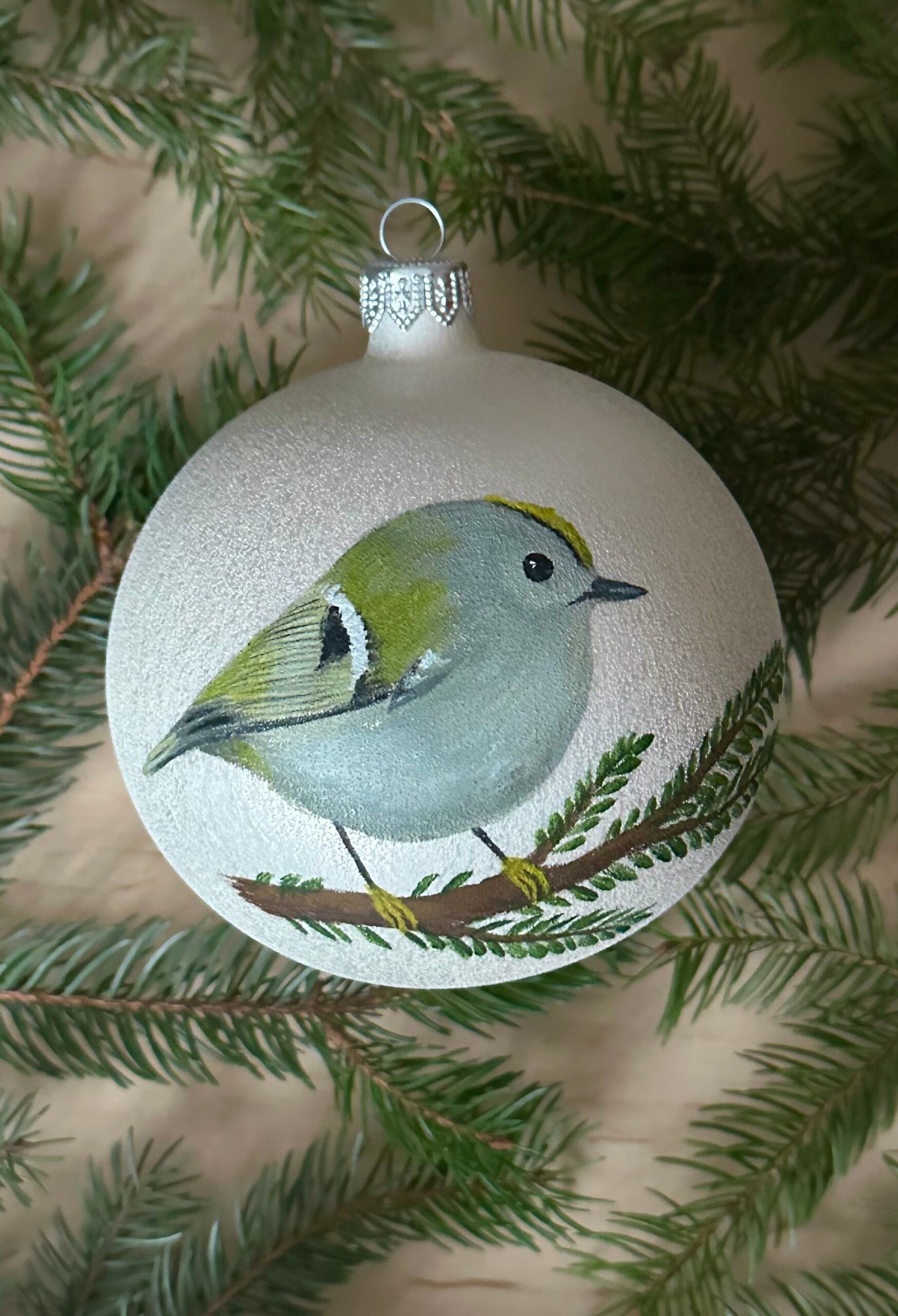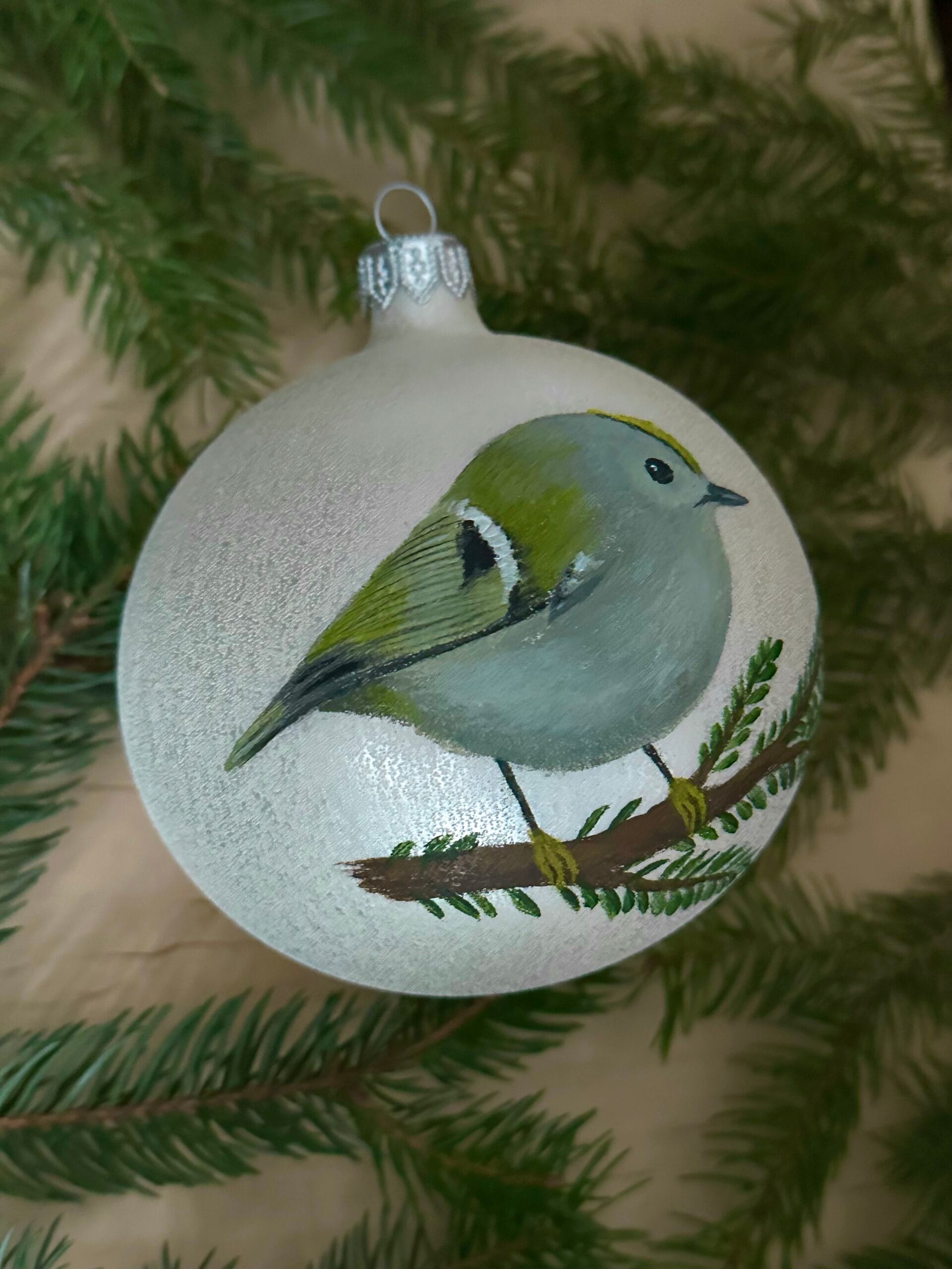Ręcznie malowana szklana bombka z mysikrólikiem. Elegancka, zdobiona z zachowaniem największej staranności przy użyciu farb akrylowych. Pakowana w ozdobne sztywne pudełko. Z tyłu możliwość dodania dedykacji lub własnego wzoru (większe, bardziej skomplikowane wzory dodatkowo płatne) – w razie potrzeby proszę o wiadomość.