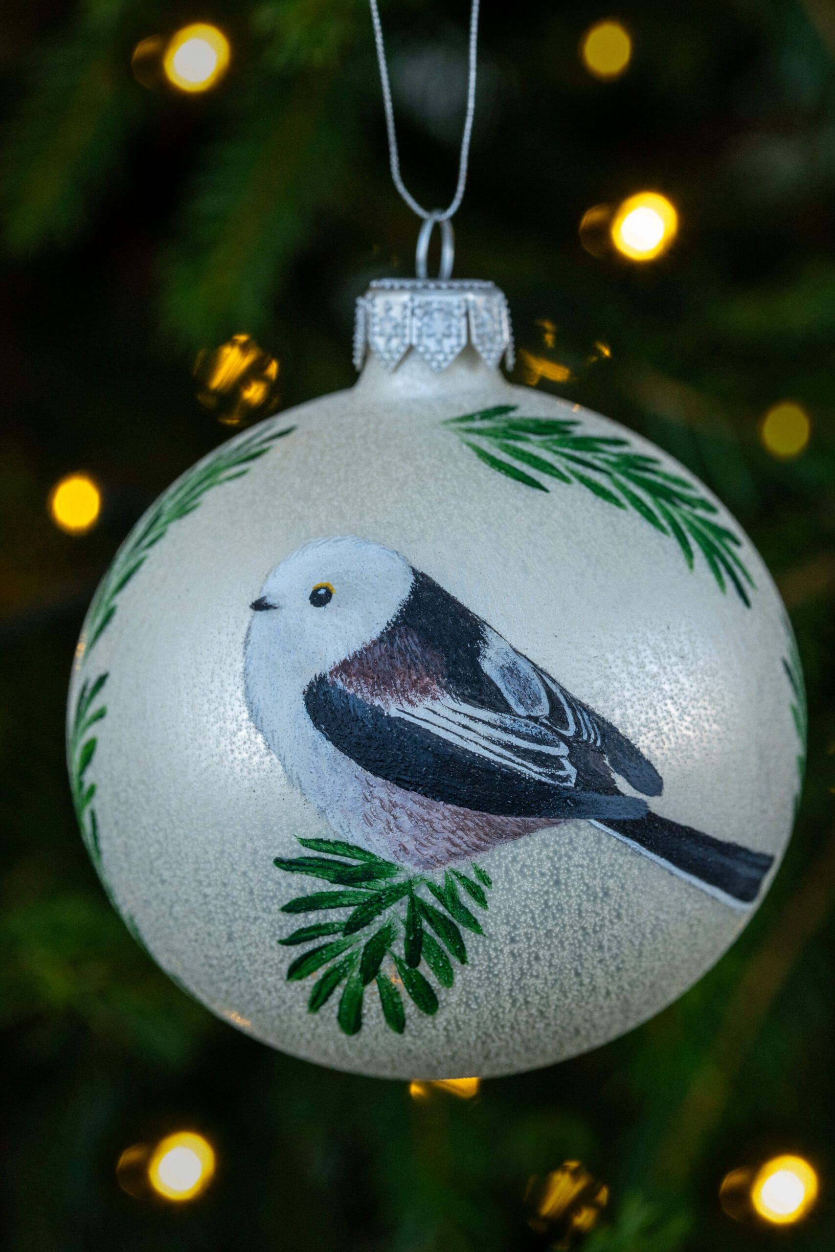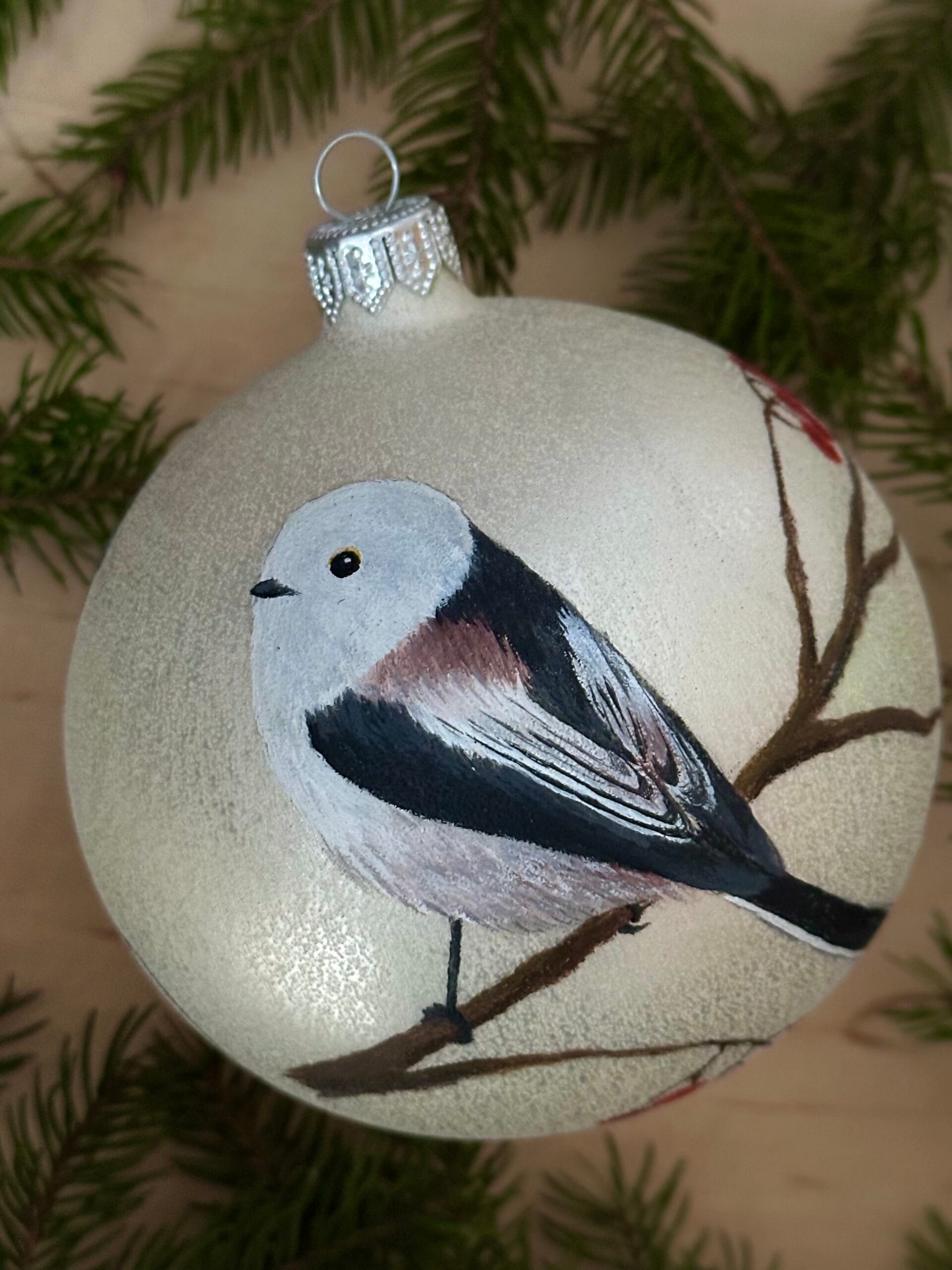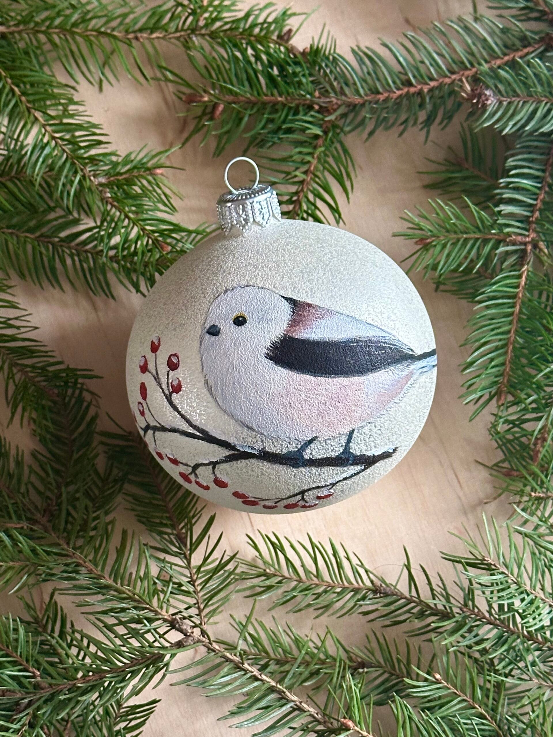 Bombka malowana na zamówienie, efekt końcowy może delikatnie różnić się od tego na zdjęciu, z uwagi na ręczne wykonanie. Istnieje możliwość zmian we wzorze; pozycji zwierzęcia i jego otoczeniu, np. wymiana jodełki na jarzębinę i odwrotnie.