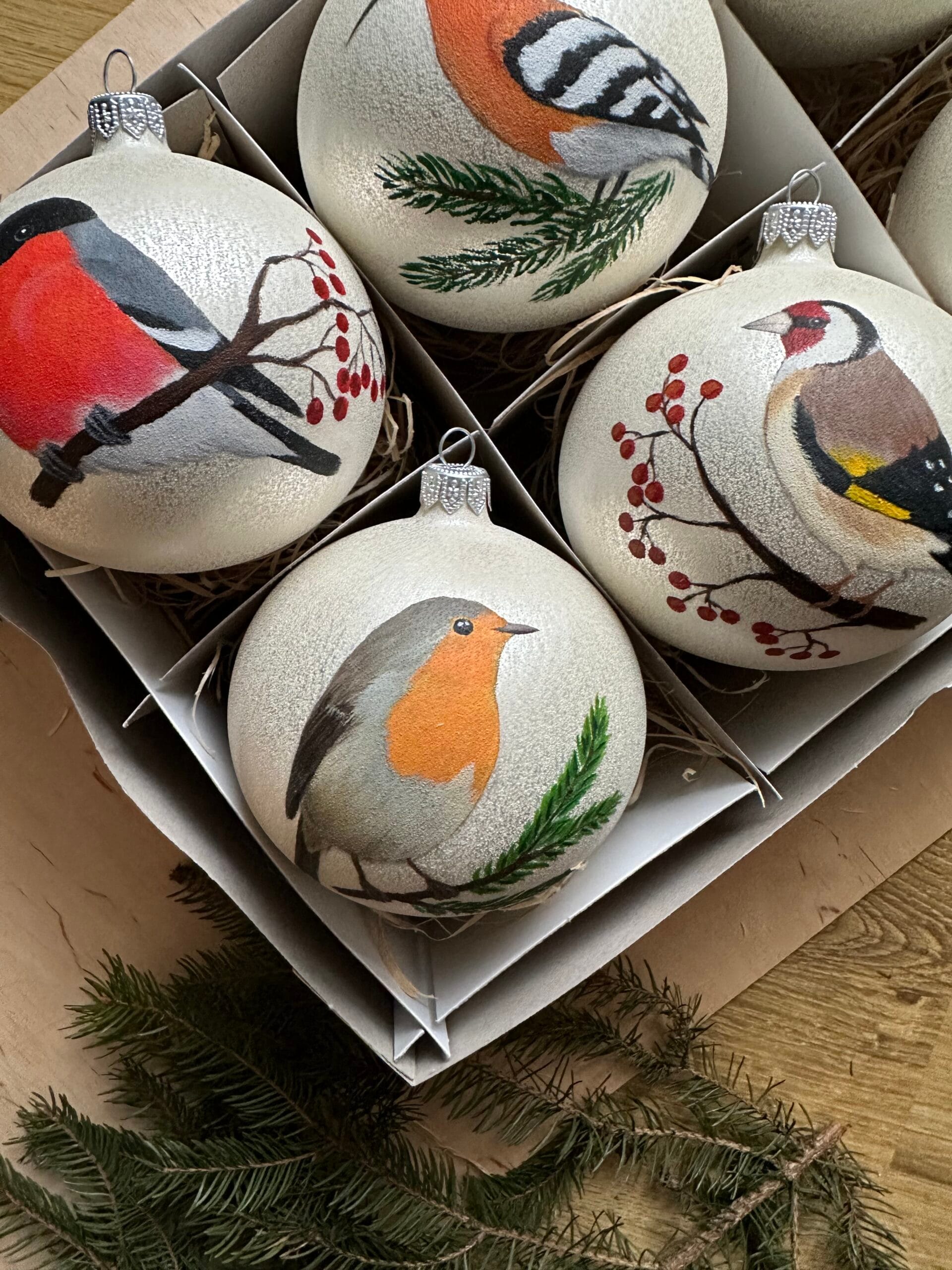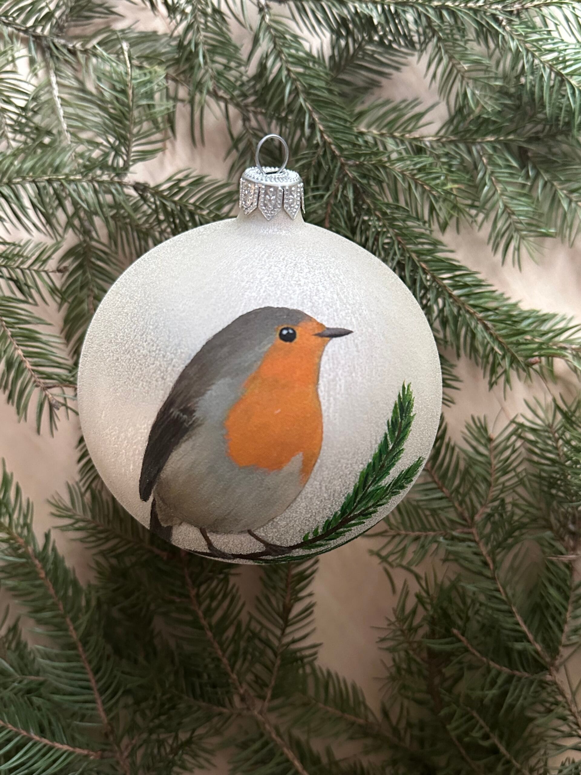 Bombka malowana na zamówienie, efekt końcowy może delikatnie różnić się od tego na zdjęciu, z uwagi na ręczne wykonanie. Istnieje możliwość zmian we wzorze; pozycji zwierzęcia i jego otoczeniu, np. wymiana jodełki na jarzębinę i odwrotnie.