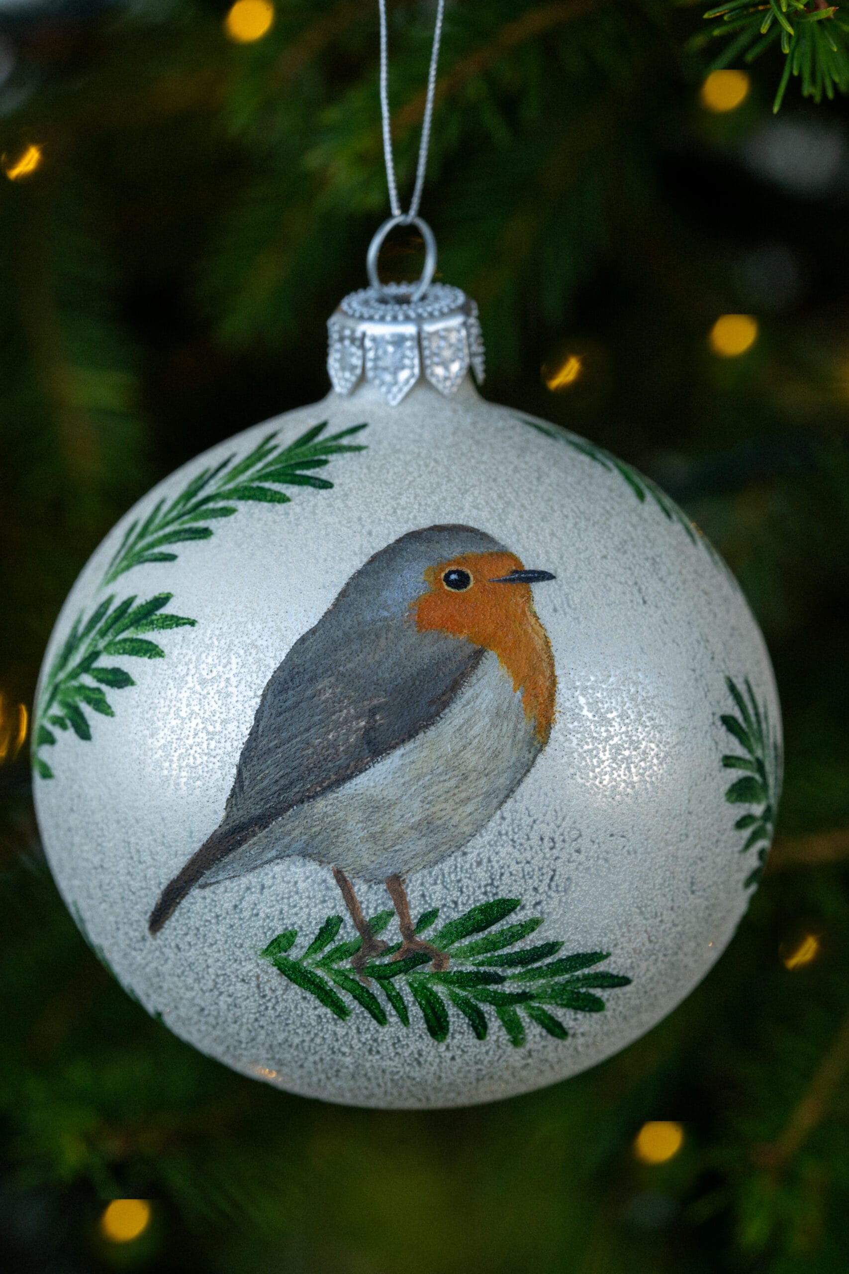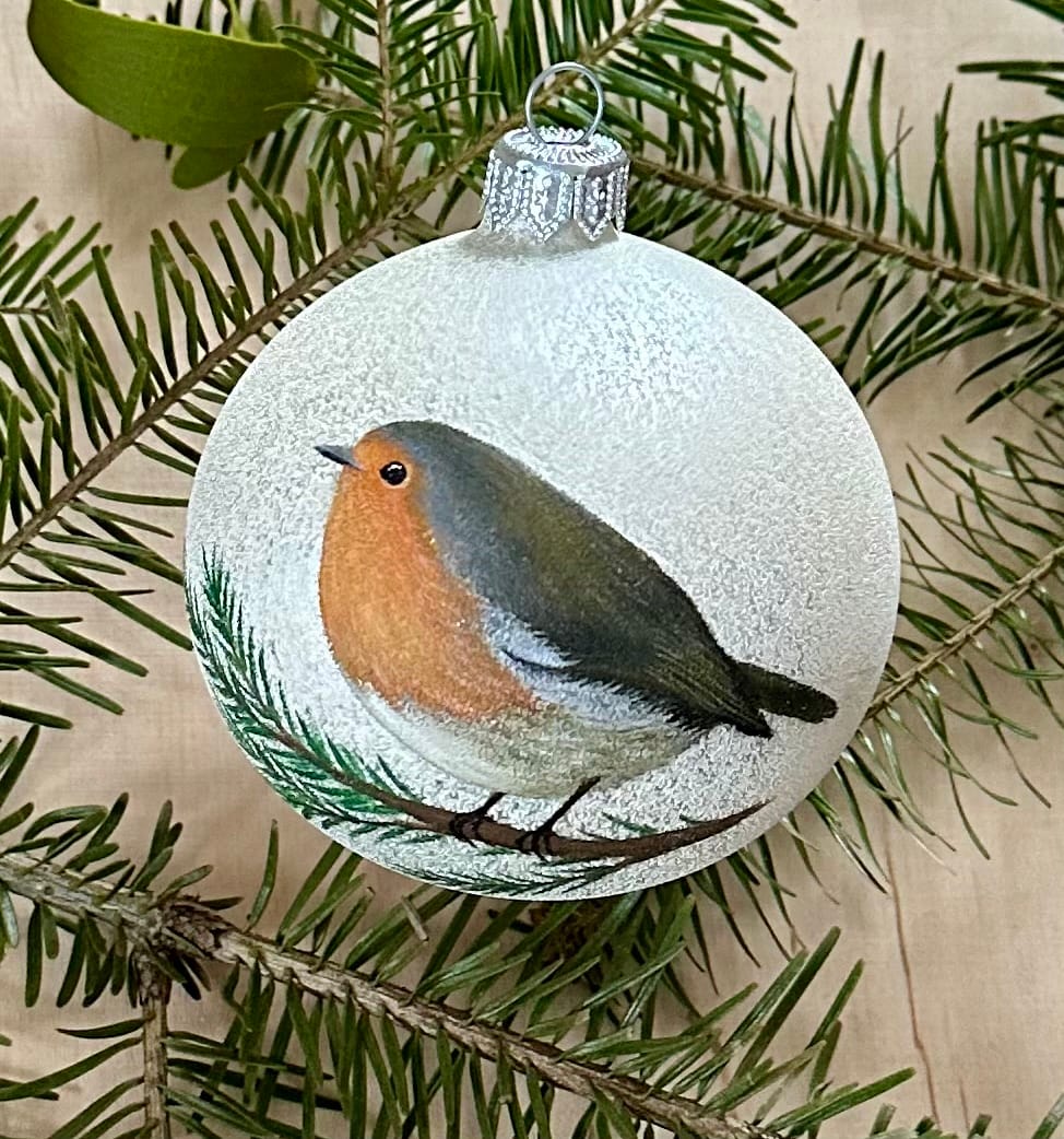 Ręcznie malowana szklana bombka z rudzikiem. Elegancka, zdobiona z zachowaniem największej staranności przy użyciu farb akrylowych. Pakowana w ozdobne sztywne pudełko. Z tyłu możliwość dodania dedykacji lub własnego wzoru (większe, bardziej skomplikowane wzory dodatkowo płatne) – w razie potrzeby proszę o wiadomość.