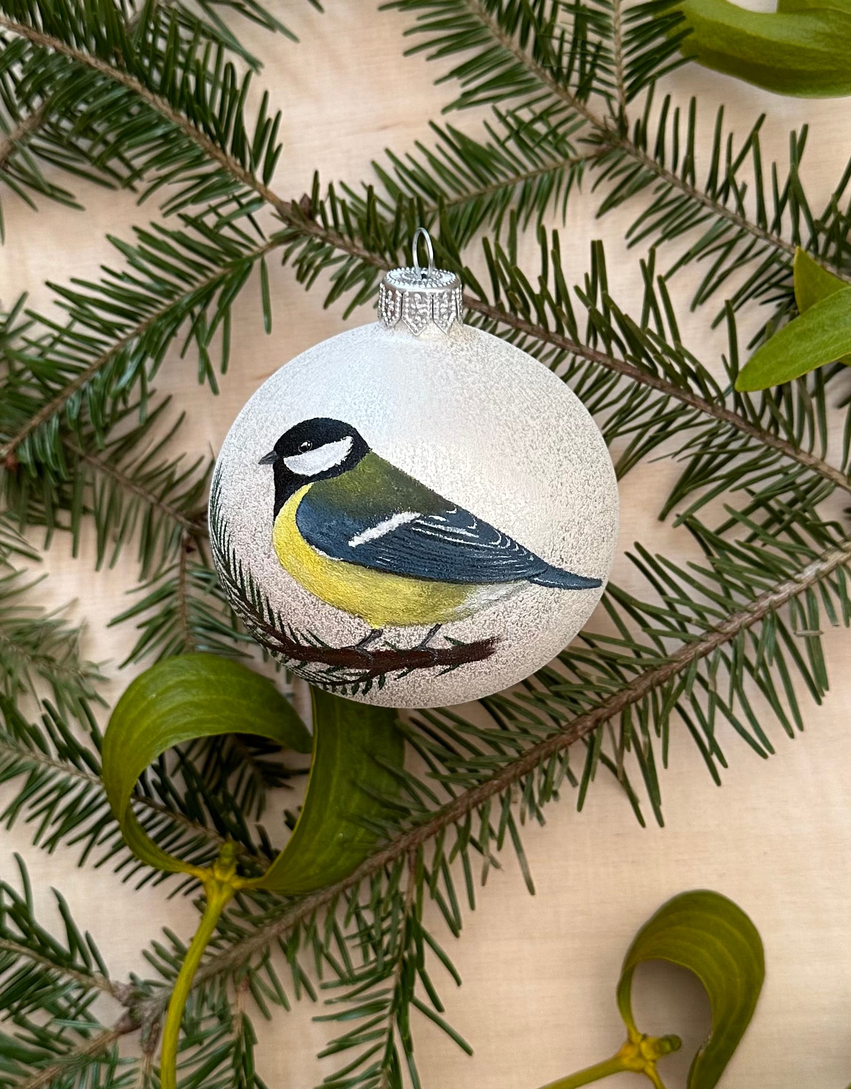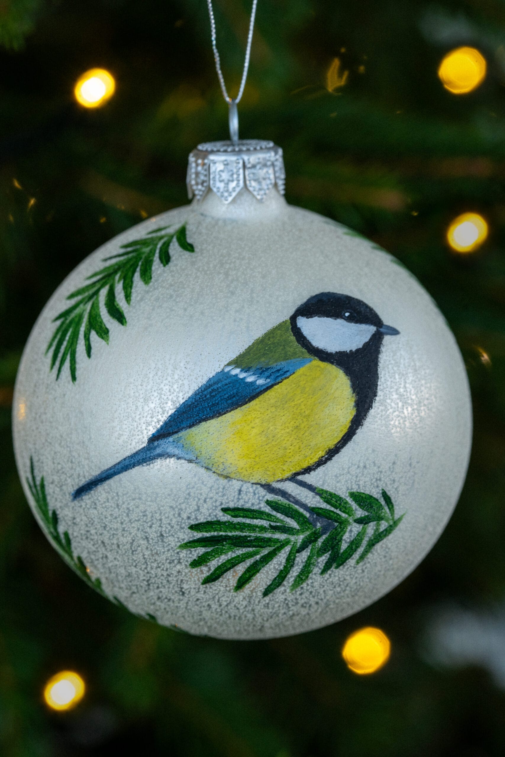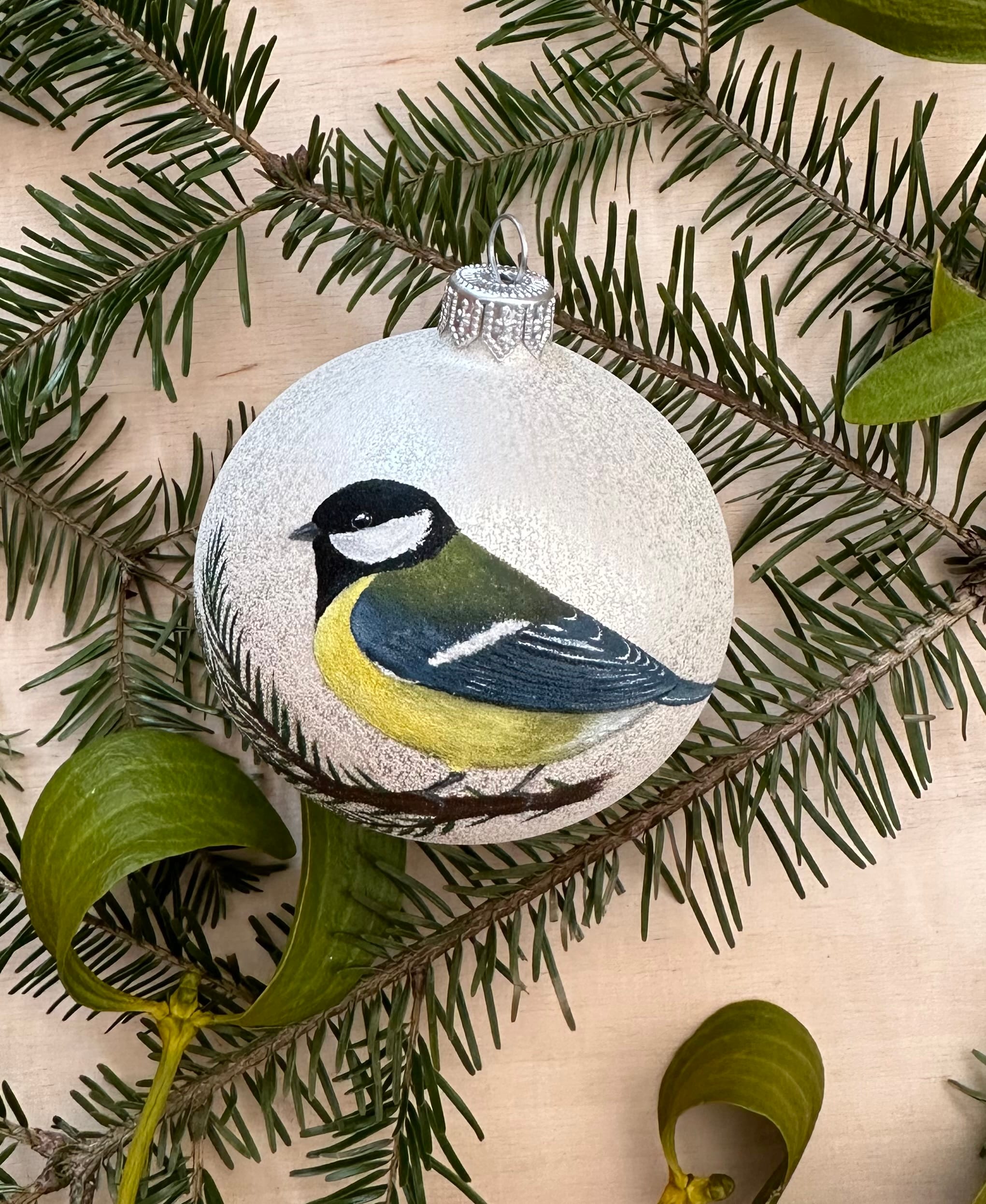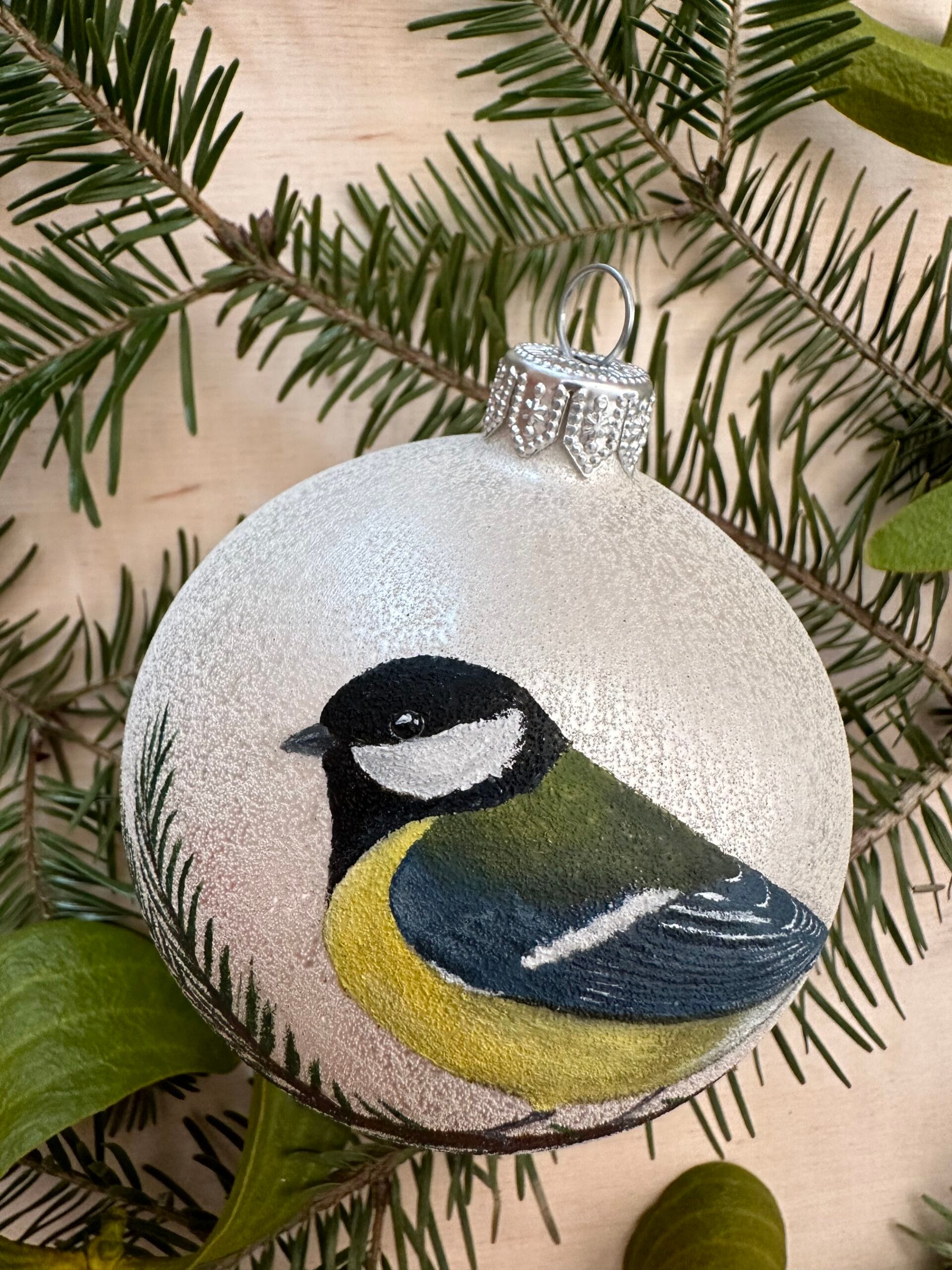 Ręcznie malowana szklana bombka z sikorką bogatką. Elegancka, zdobiona z zachowaniem największej staranności przy użyciu farb akrylowych. Pakowana w ozdobne sztywne pudełko. Z tyłu możliwość dodania dedykacji lub własnego wzoru (większe, bardziej skomplikowane wzory dodatkowo płatne) – w razie potrzeby proszę o wiadomość.