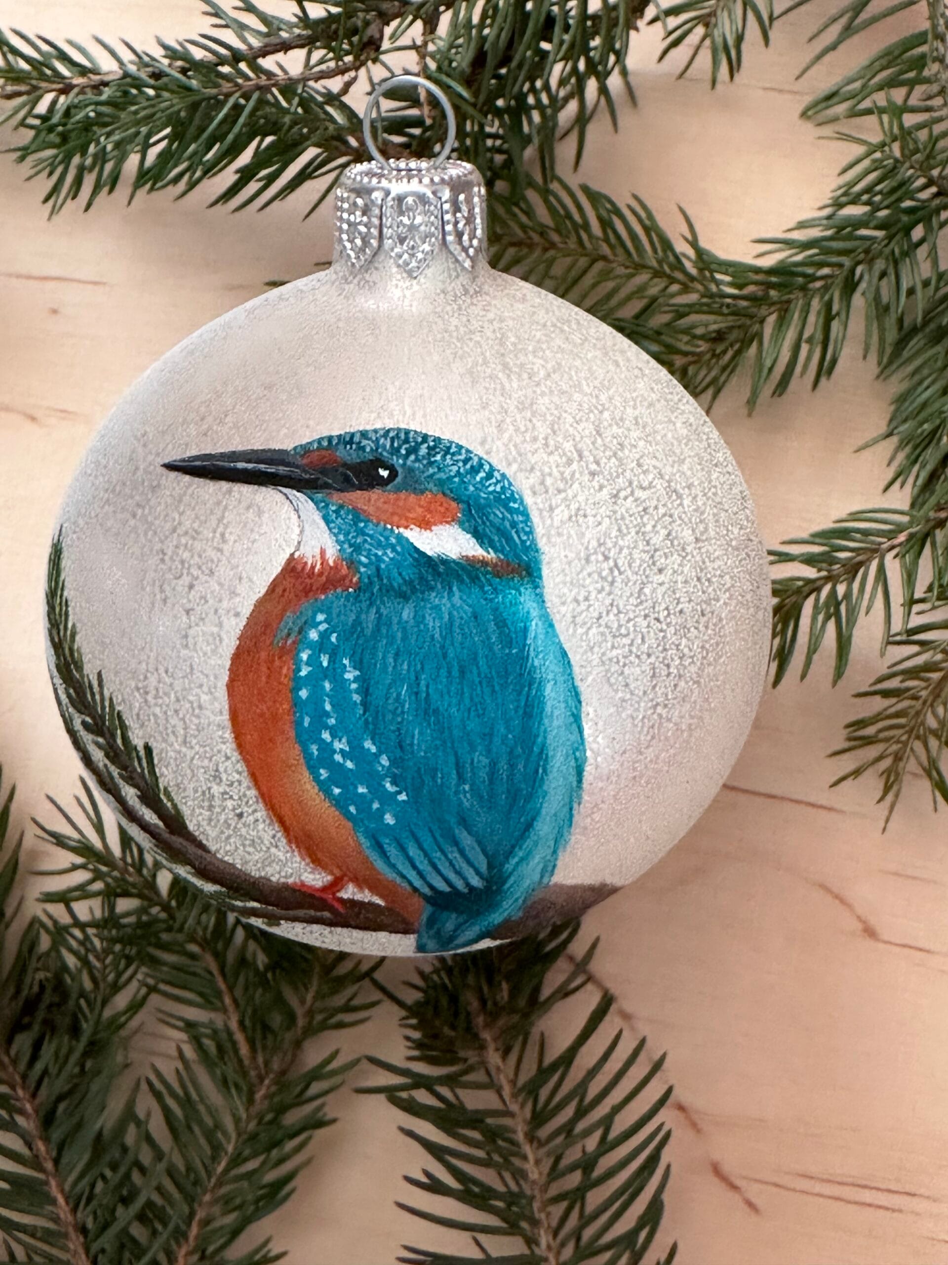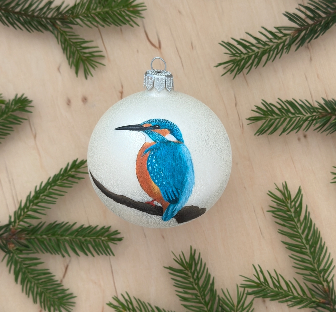 Ręcznie malowana szklana bombka z zimorodkiem. Elegancka, zdobiona z zachowaniem największej staranności przy użyciu farb akrylowych. Pakowana w ozdobne sztywne pudełko. Z tyłu możliwość dodania dedykacji lub własnego wzoru (większe, bardziej skomplikowane wzory dodatkowo płatne) – w razie potrzeby proszę o wiadomość.