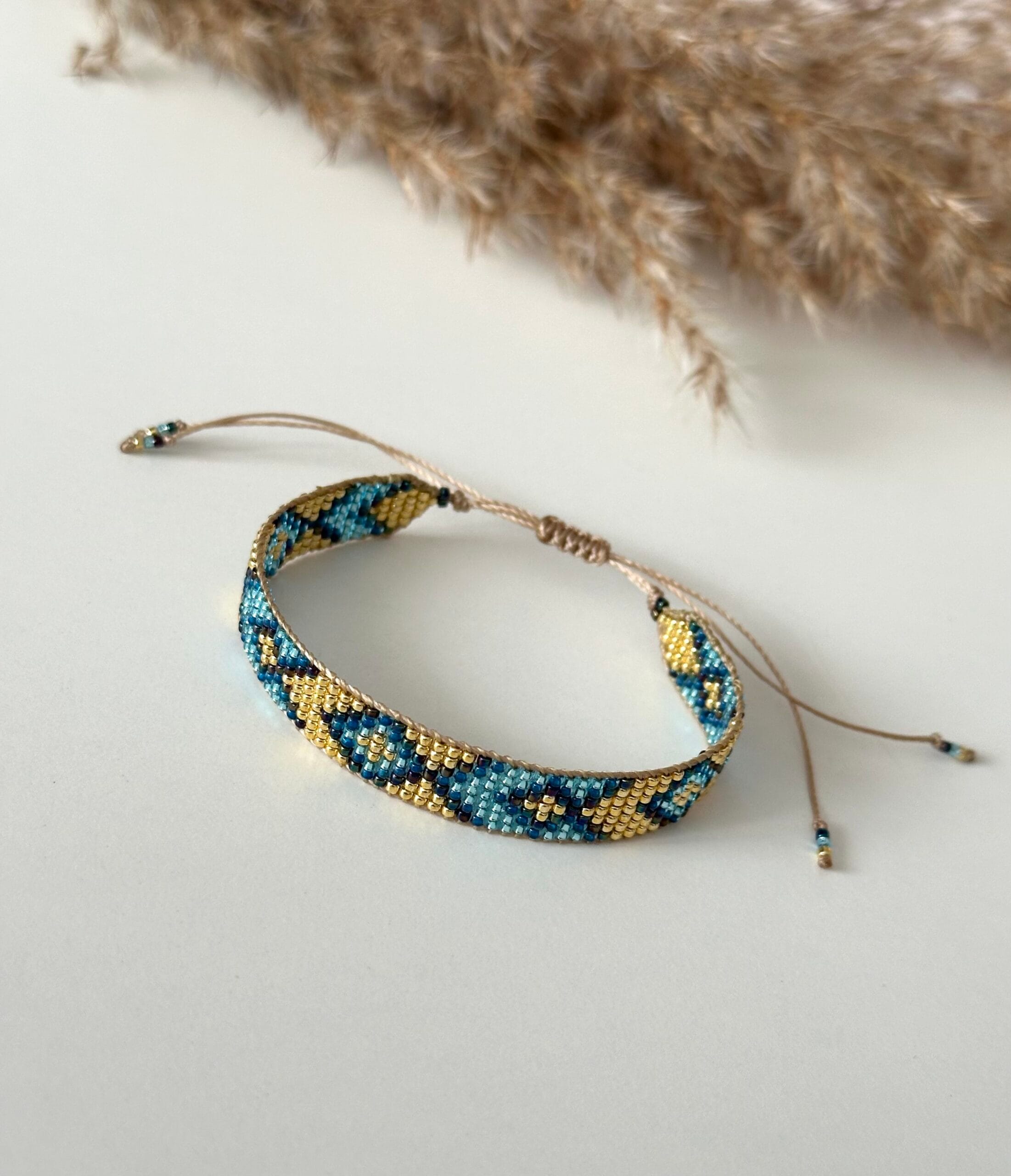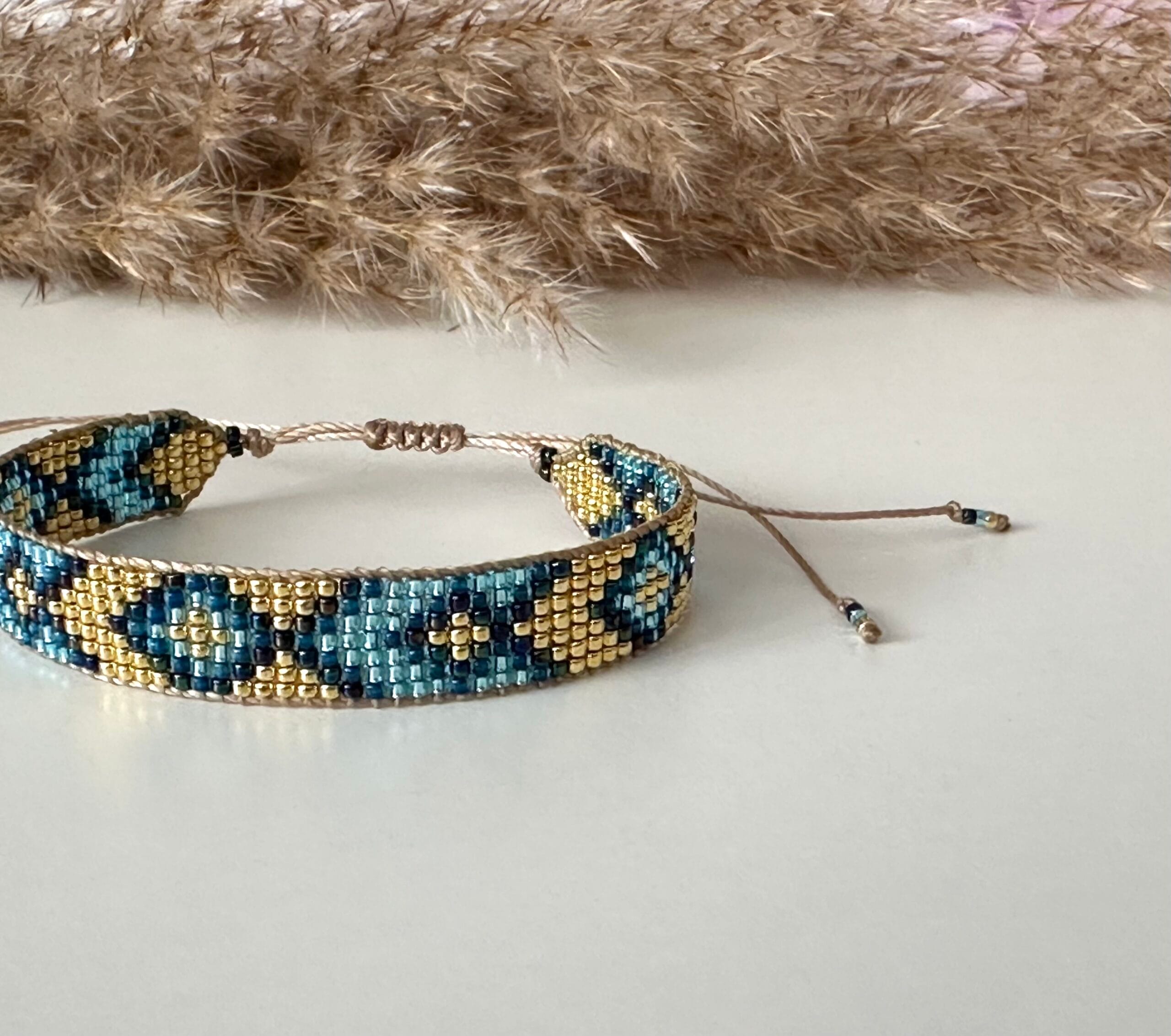 Szeroka bransoletka tkana z koralików w odcieniach złota i granatu.