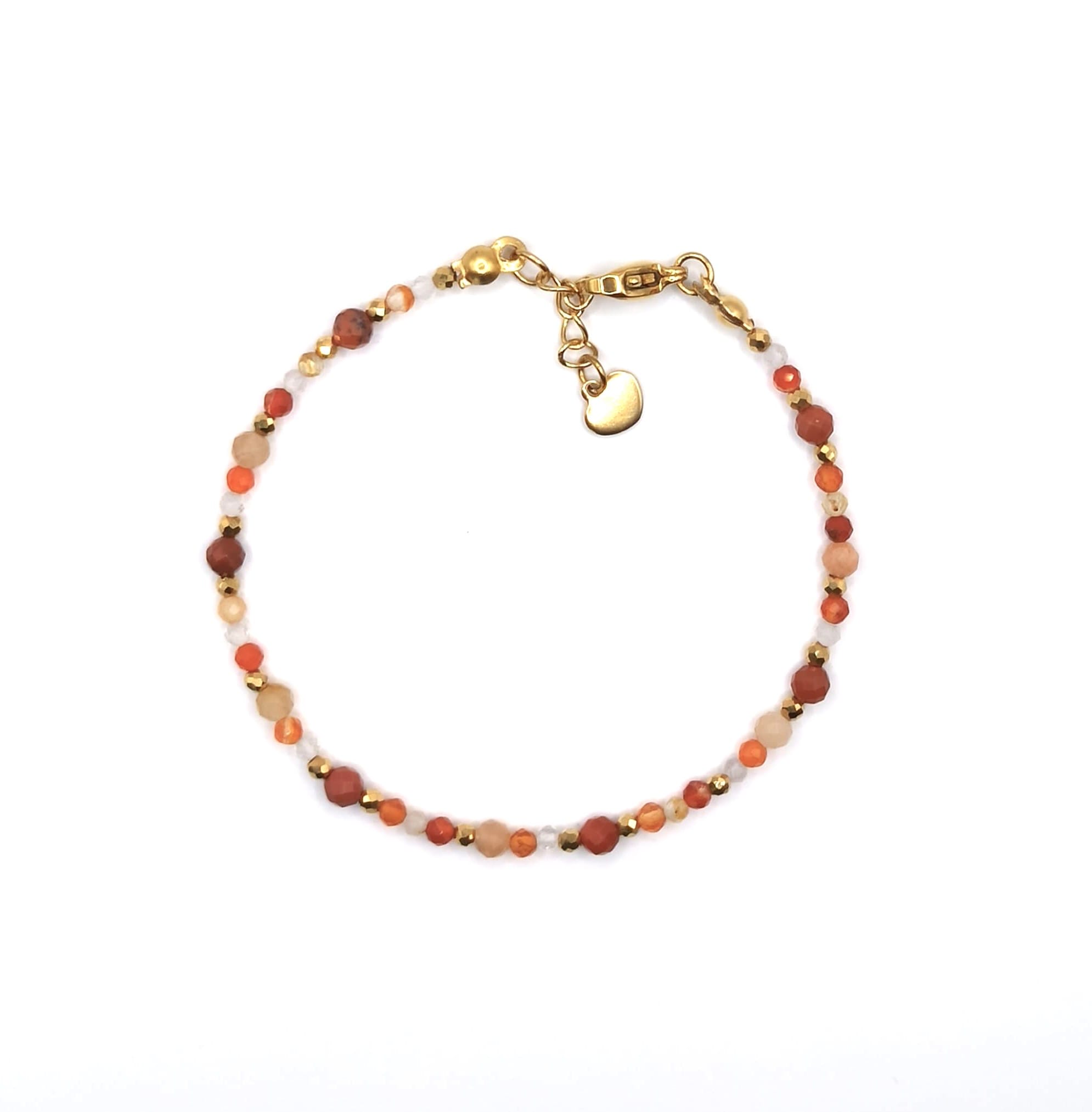 Bransoletka Feniks z kamieniem słonecznym, cytrynem, karneolem i jaspisem czerwonym, przeplatanymi hematytem. Kamienie wielkości 2-3mm. Elementy metalowe ze stali szlachetnej. Bransoletka na wytrzymałej żyłce.
