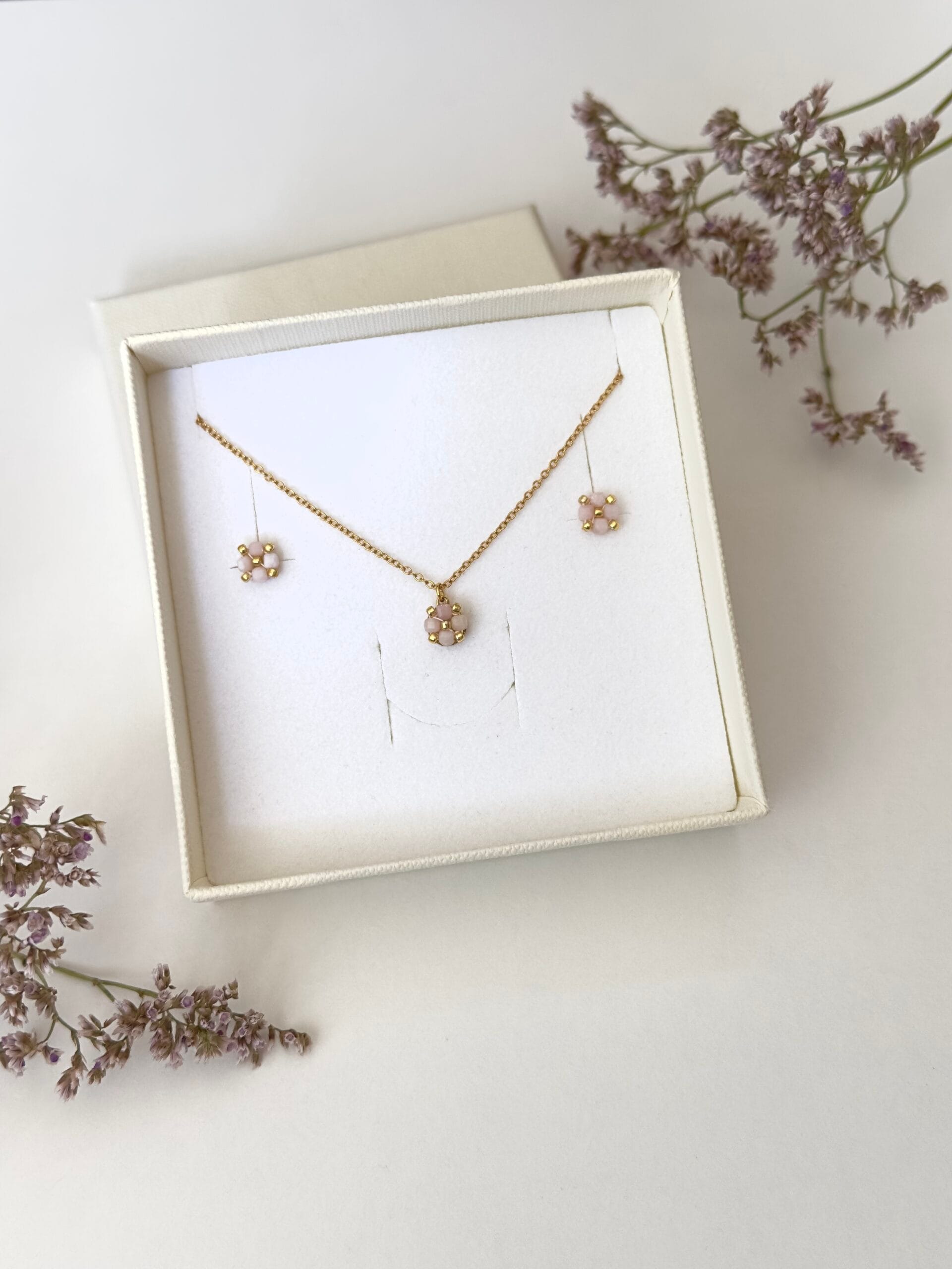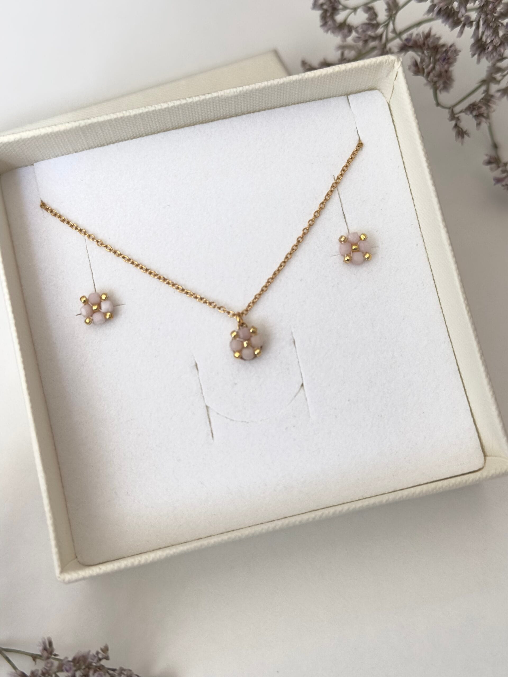 Subtelny, elegancki komplet biżuterii w odcieniu jasnego, delikatnego różu.