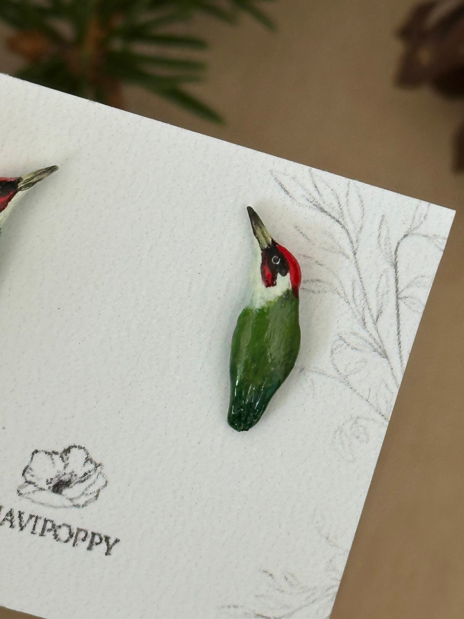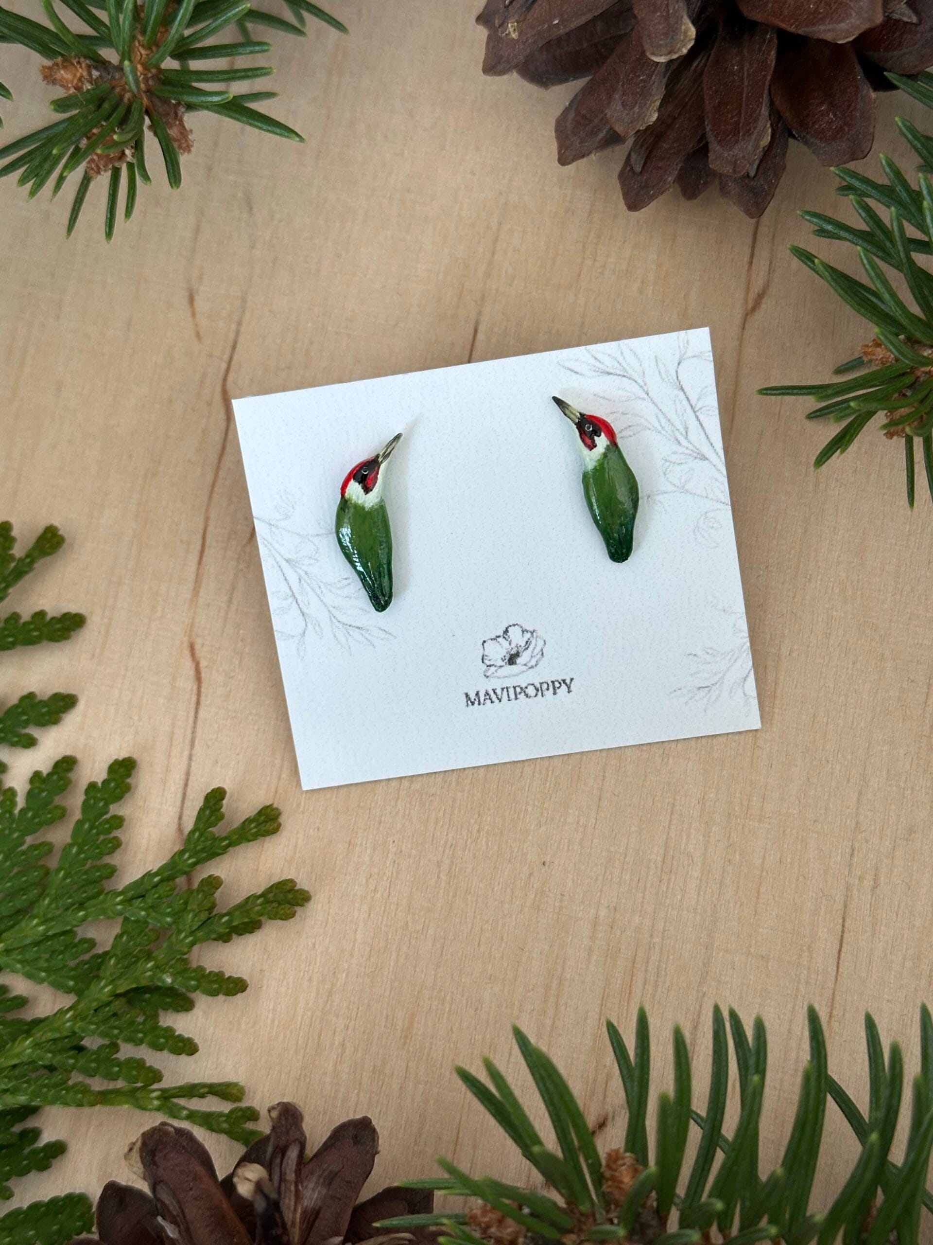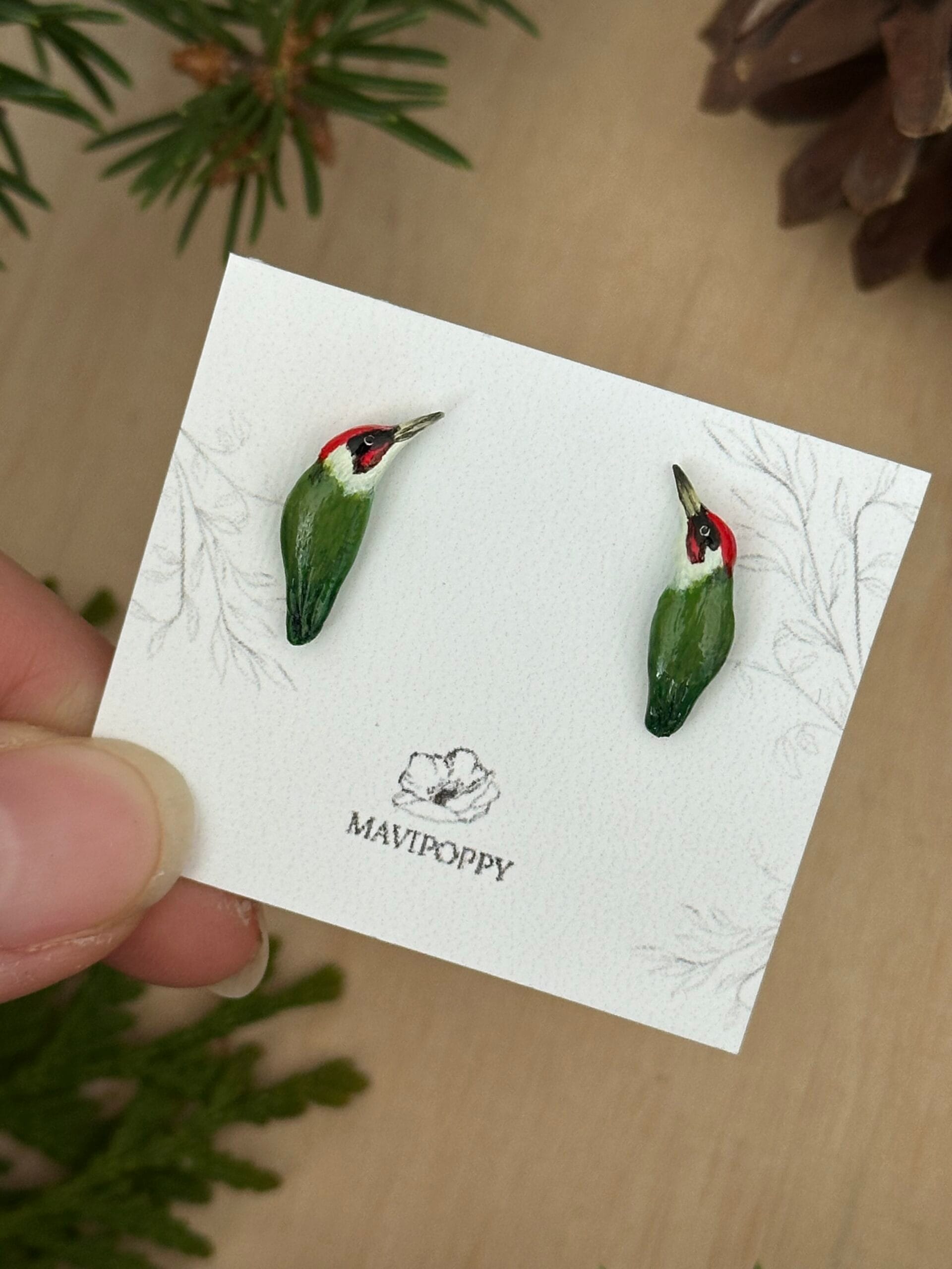 Malutkie, oryginalne kolczyki – dzięcioły zielone. Ręcznie wykonane z gliny polimerowej, na sztyfcie ze stali szlachetnej, która się nie odbarwia i nie powoduje reakcji alergicznych.