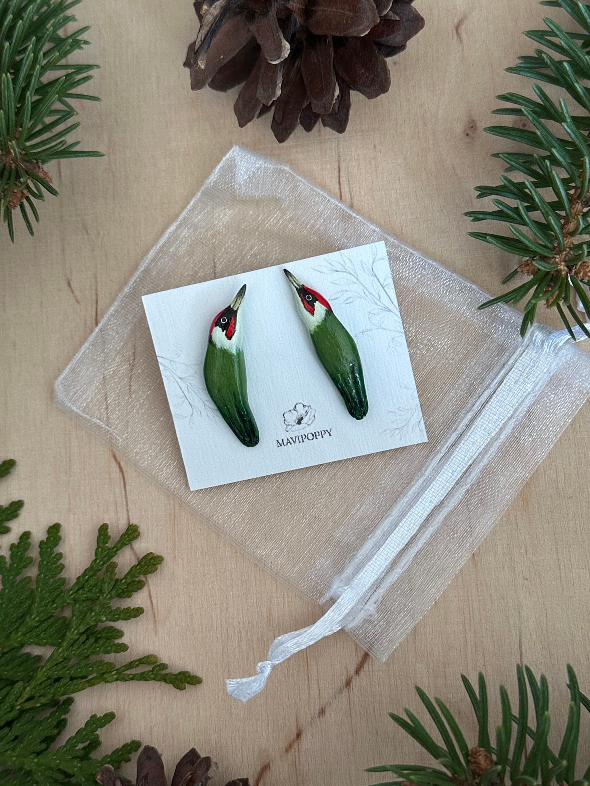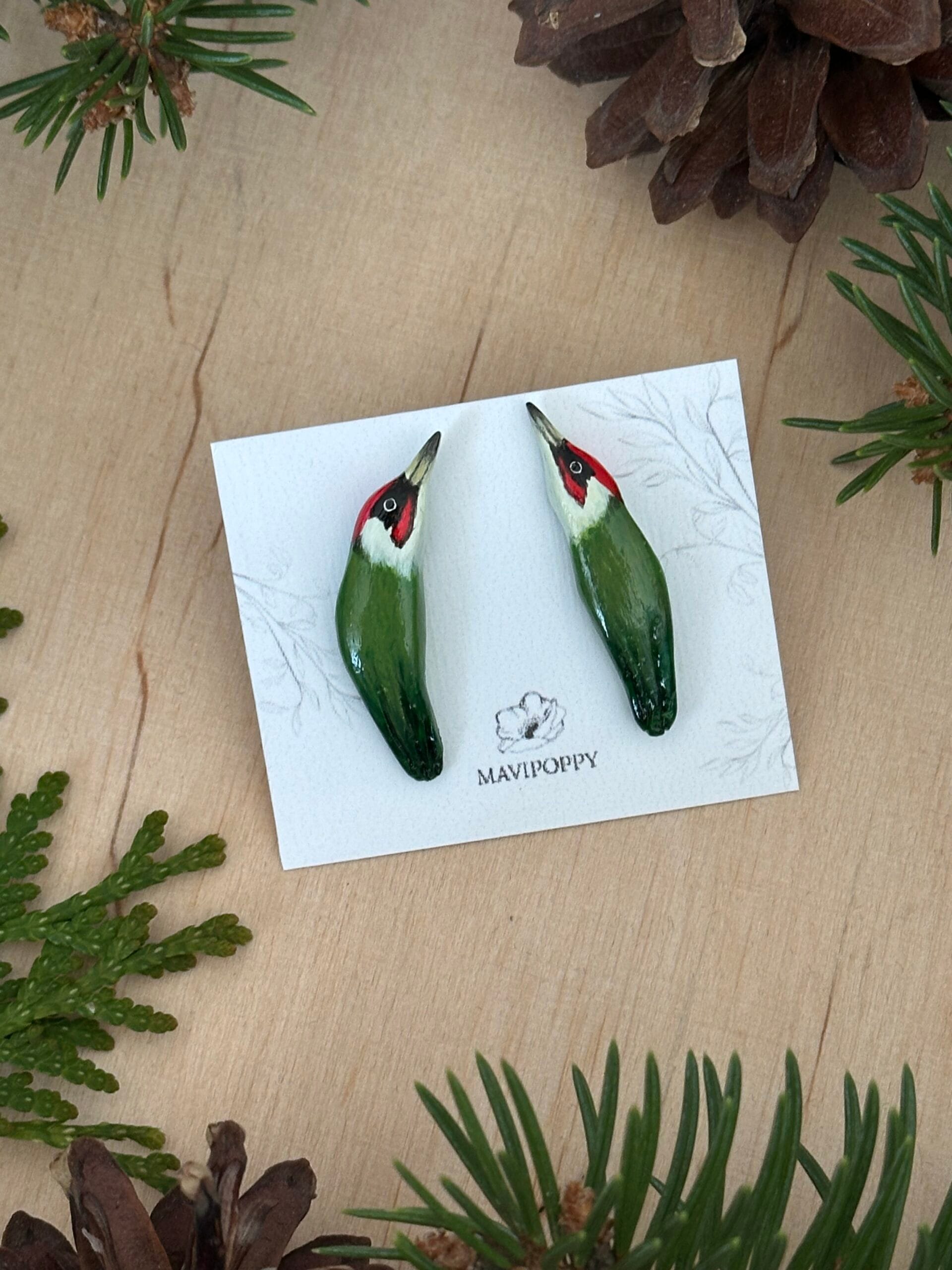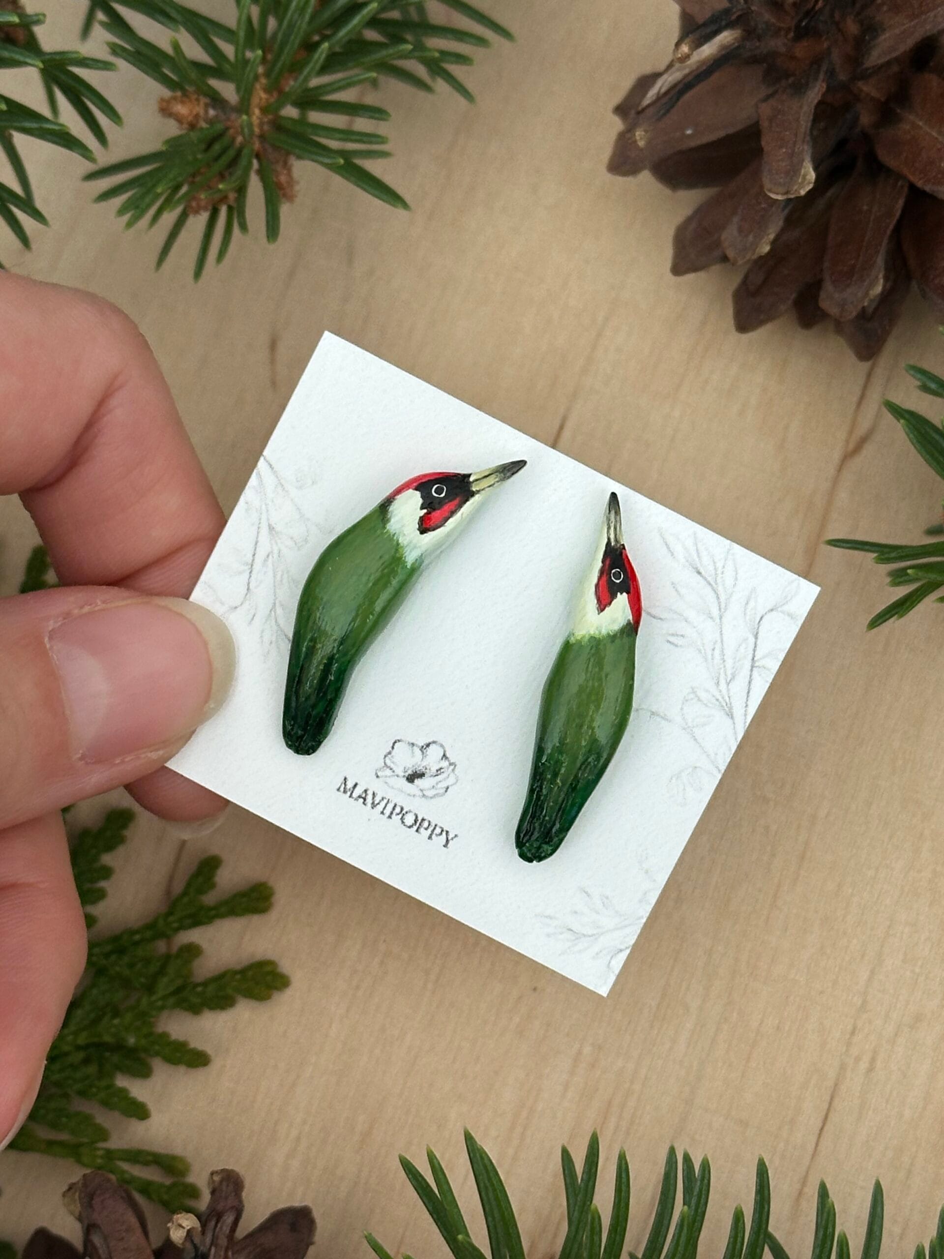 Malutkie, oryginalne kolczyki – dzięcioły zielone. Ręcznie wykonane z gliny polimerowej, na sztyfcie ze stali szlachetnej, która się nie odbarwia i nie powoduje reakcji alergicznych.
