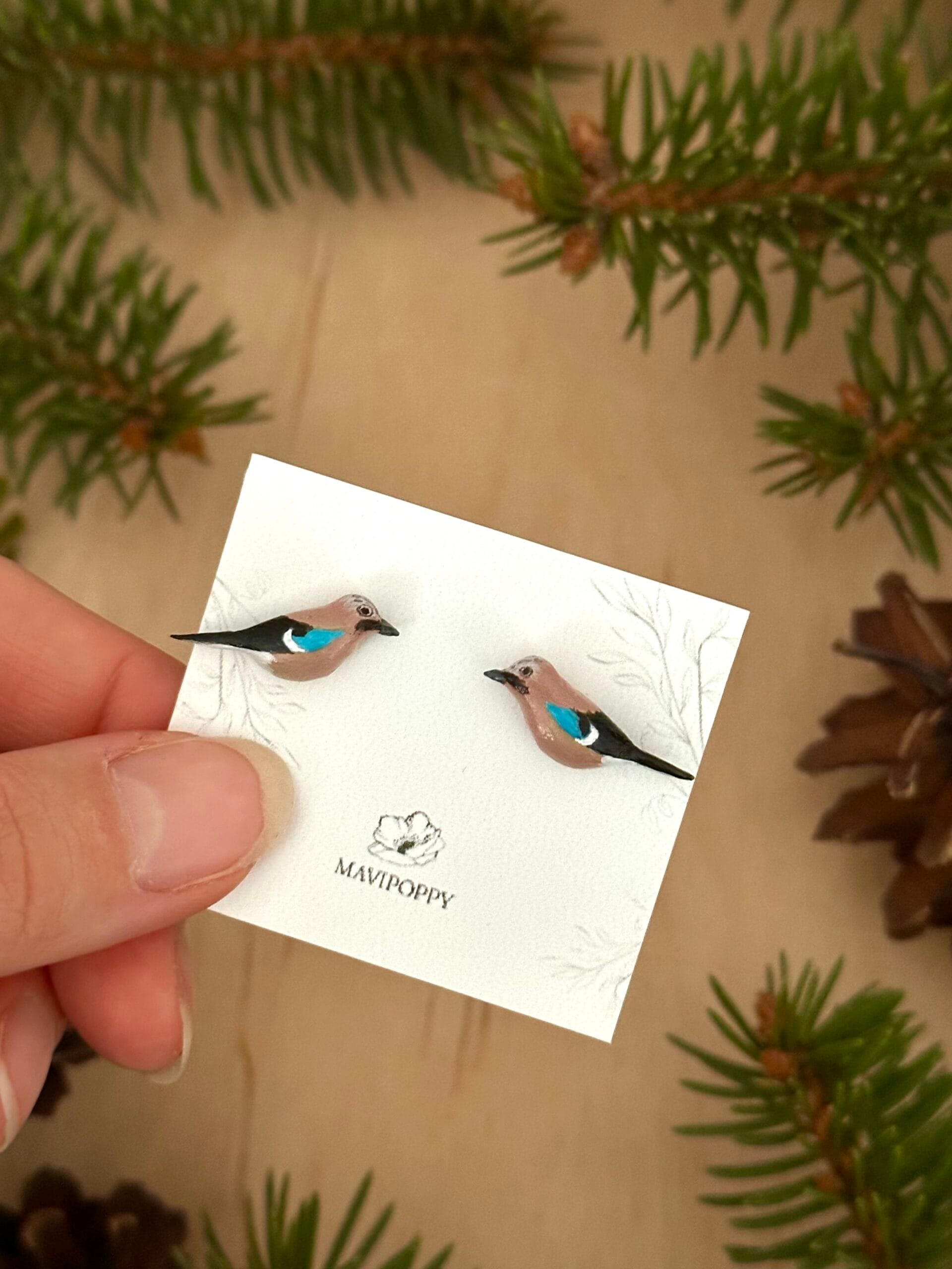 Malutkie, kolorowe kolczyki – sójki. Ręcznie wykonane z gliny polimerowej, na sztyfcie ze stali szlachetnej, która nie powoduje reakcji alergicznych.