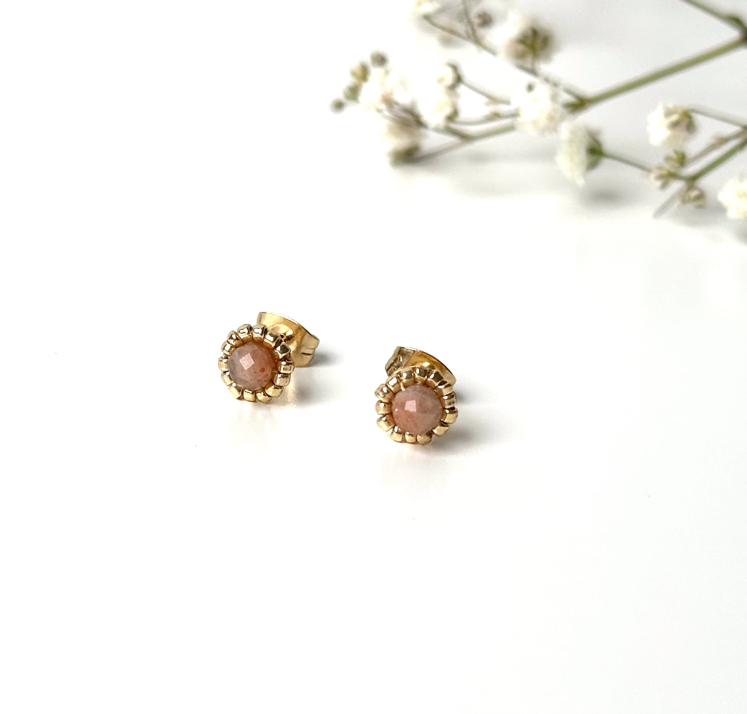 Delikatne, kobiece kolczyki sztyfty ze stali szlachetnej w kolorze złota. Kamień słoneczny połączony ze szklanymi koralikami toho.