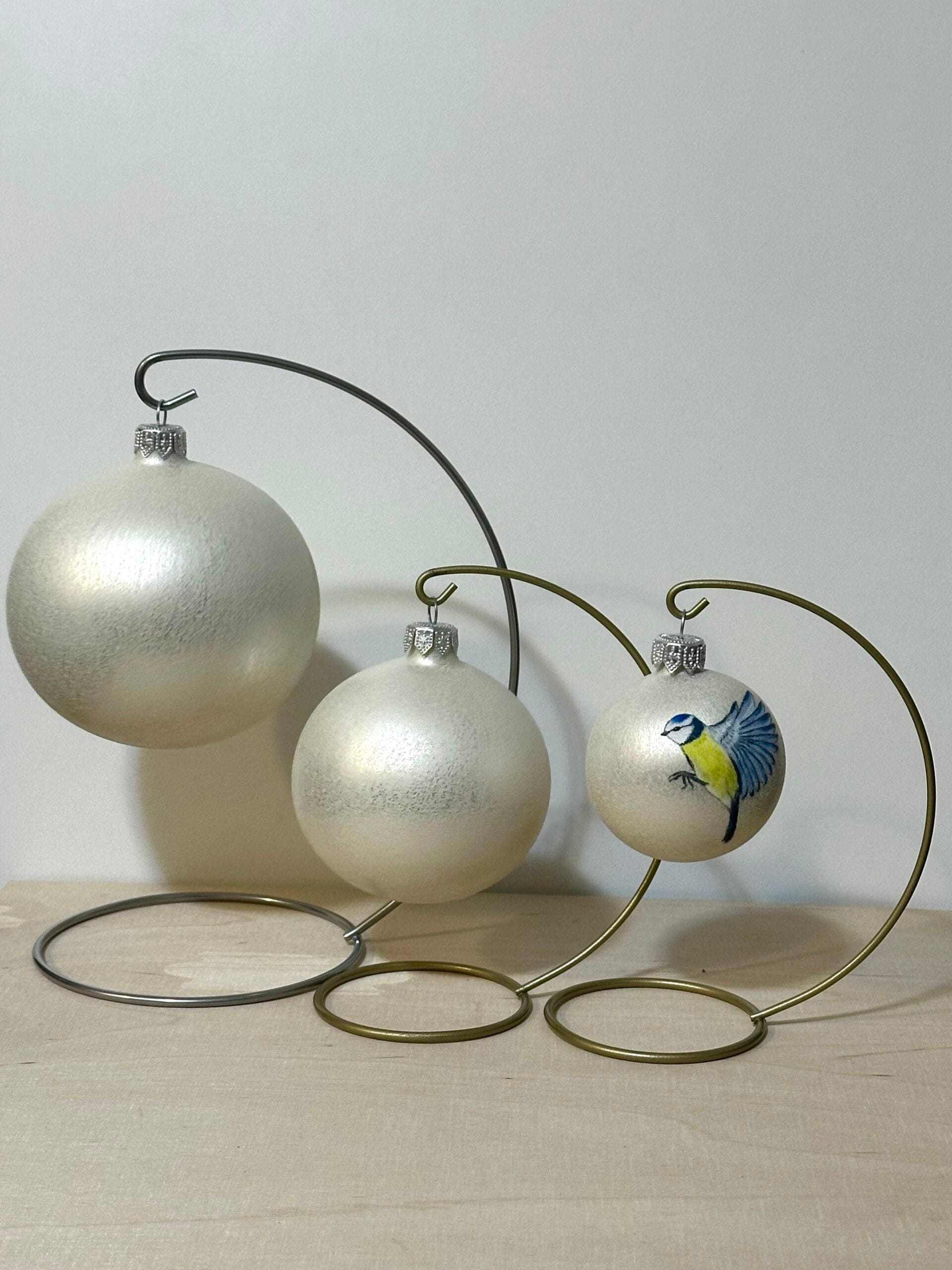 Stojak na bombkę. Największa bombka ma 10cm średnicy, średnia 8cm, najmniejsza 6cm.