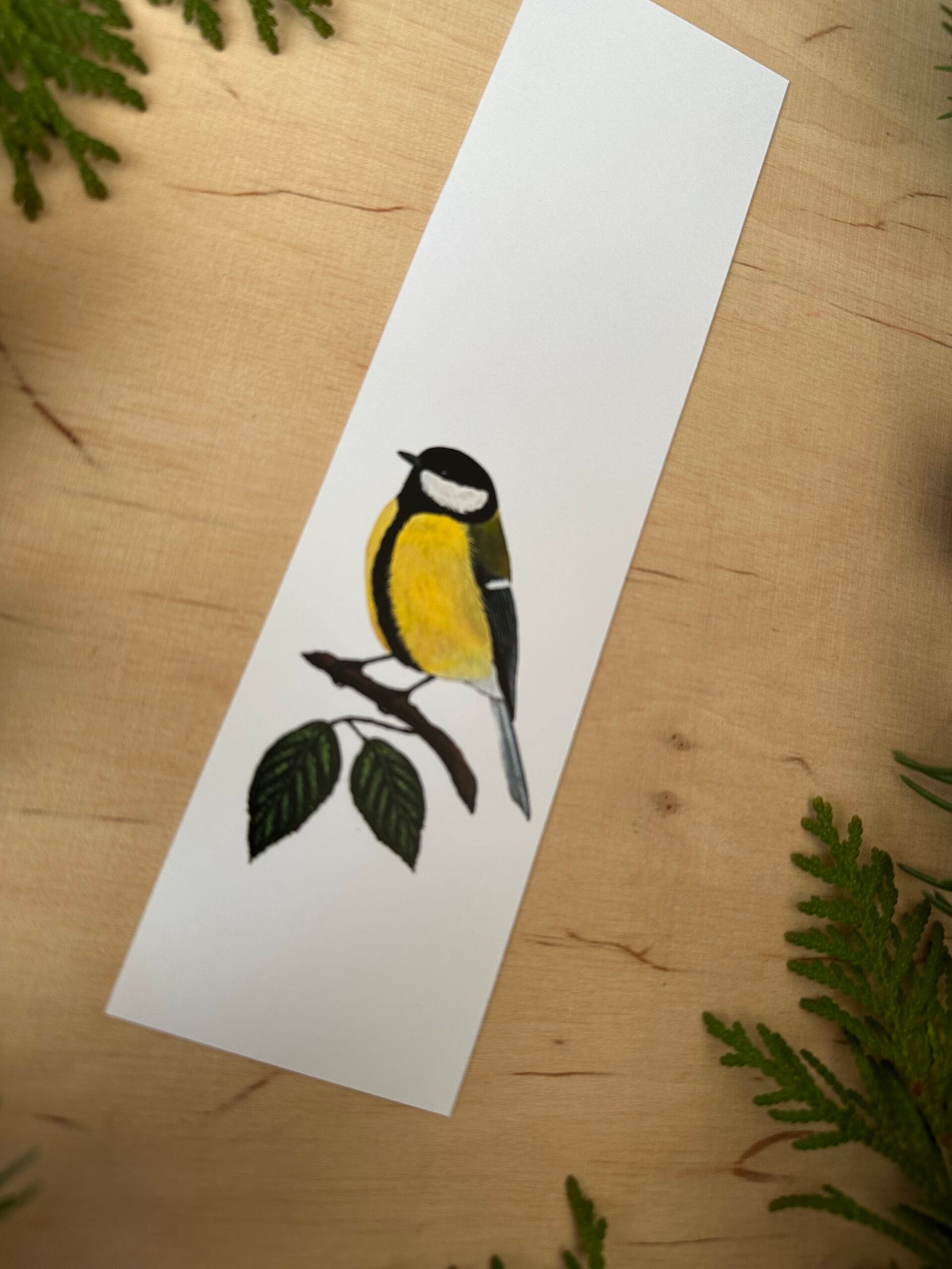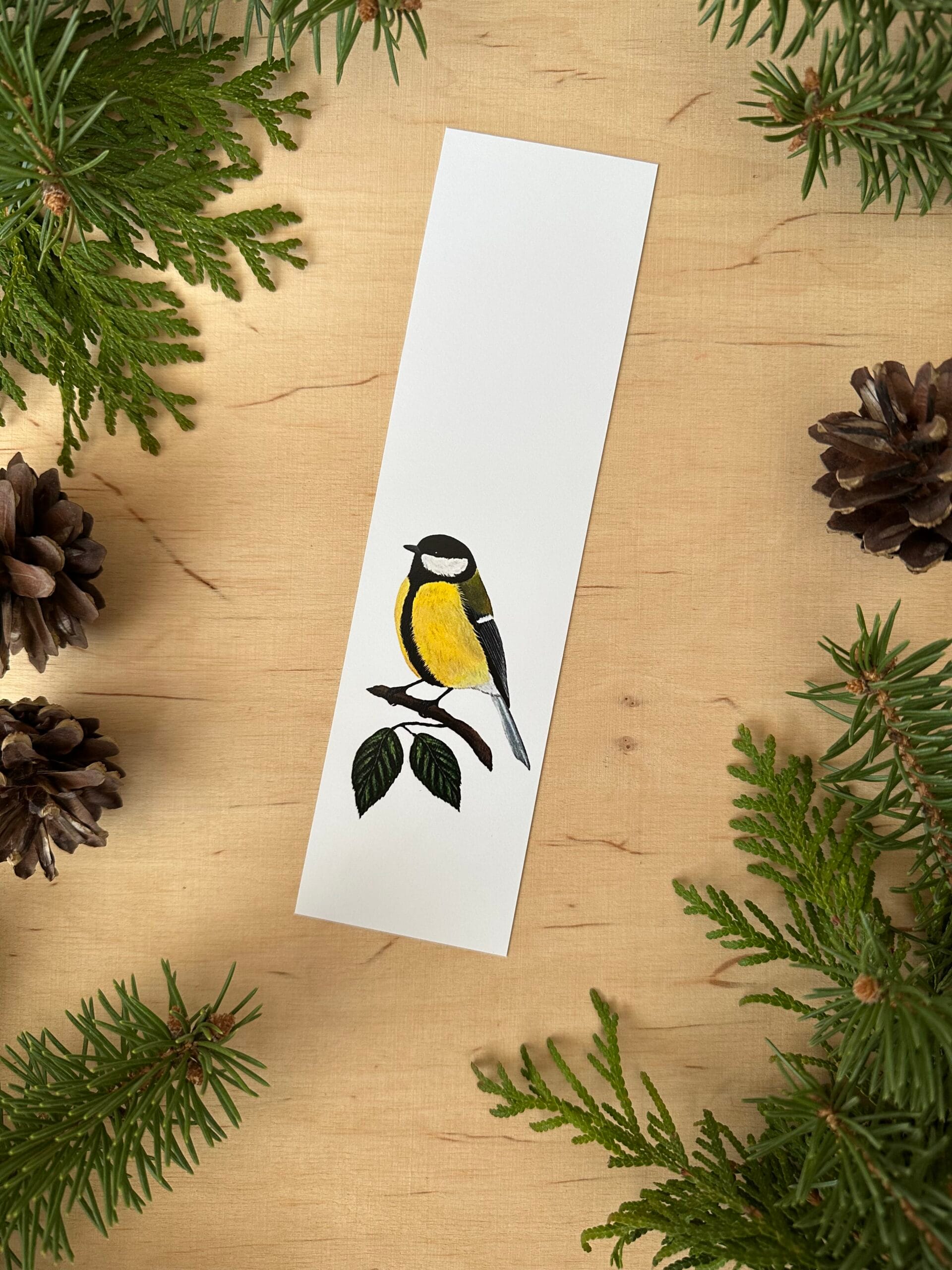 Zakładka z wydrukiem autorskiego malunku sikorki bogatki.