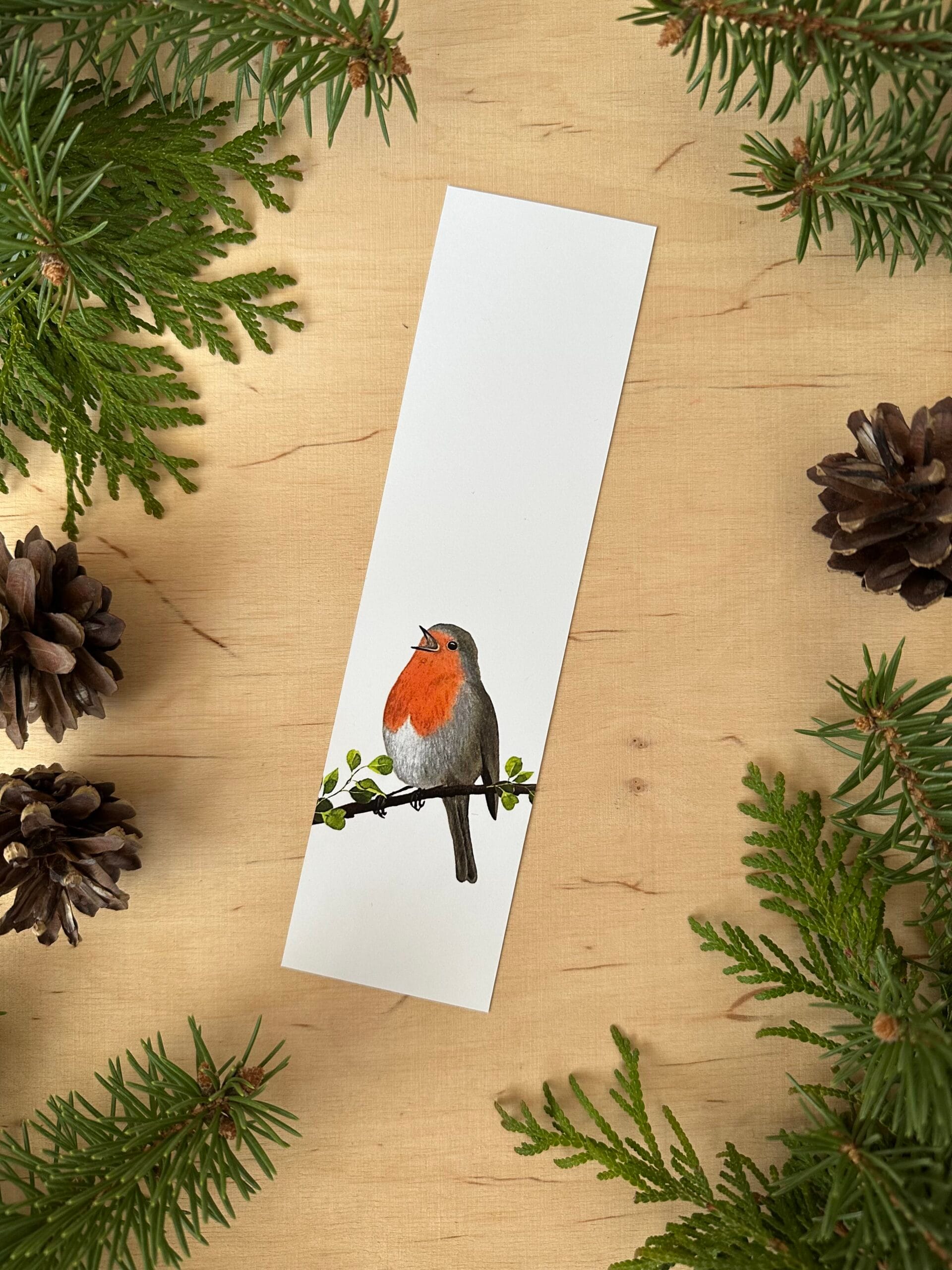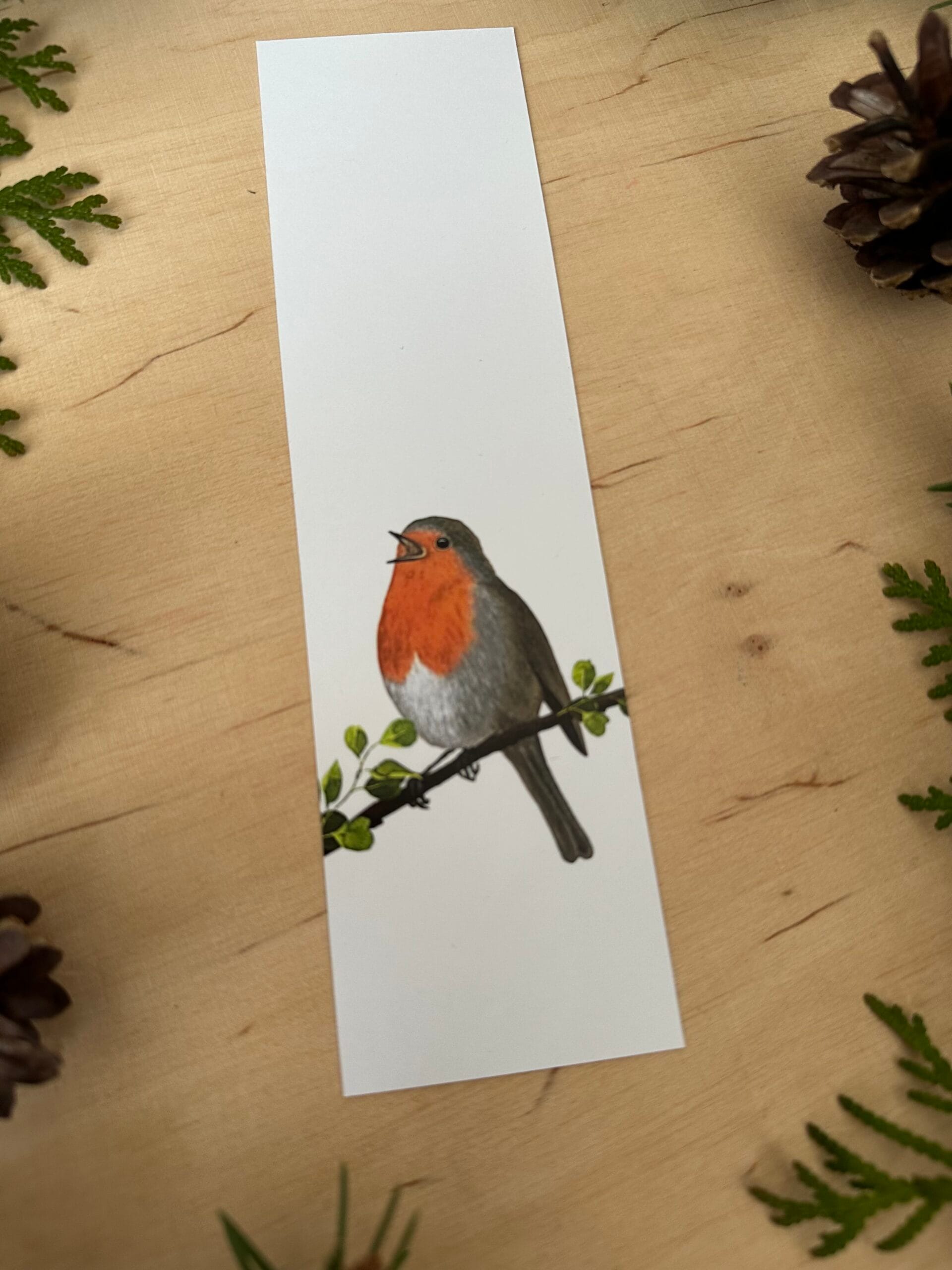 Zakładka z wydrukiem autorskiego malunku śpiewającego rudzika.