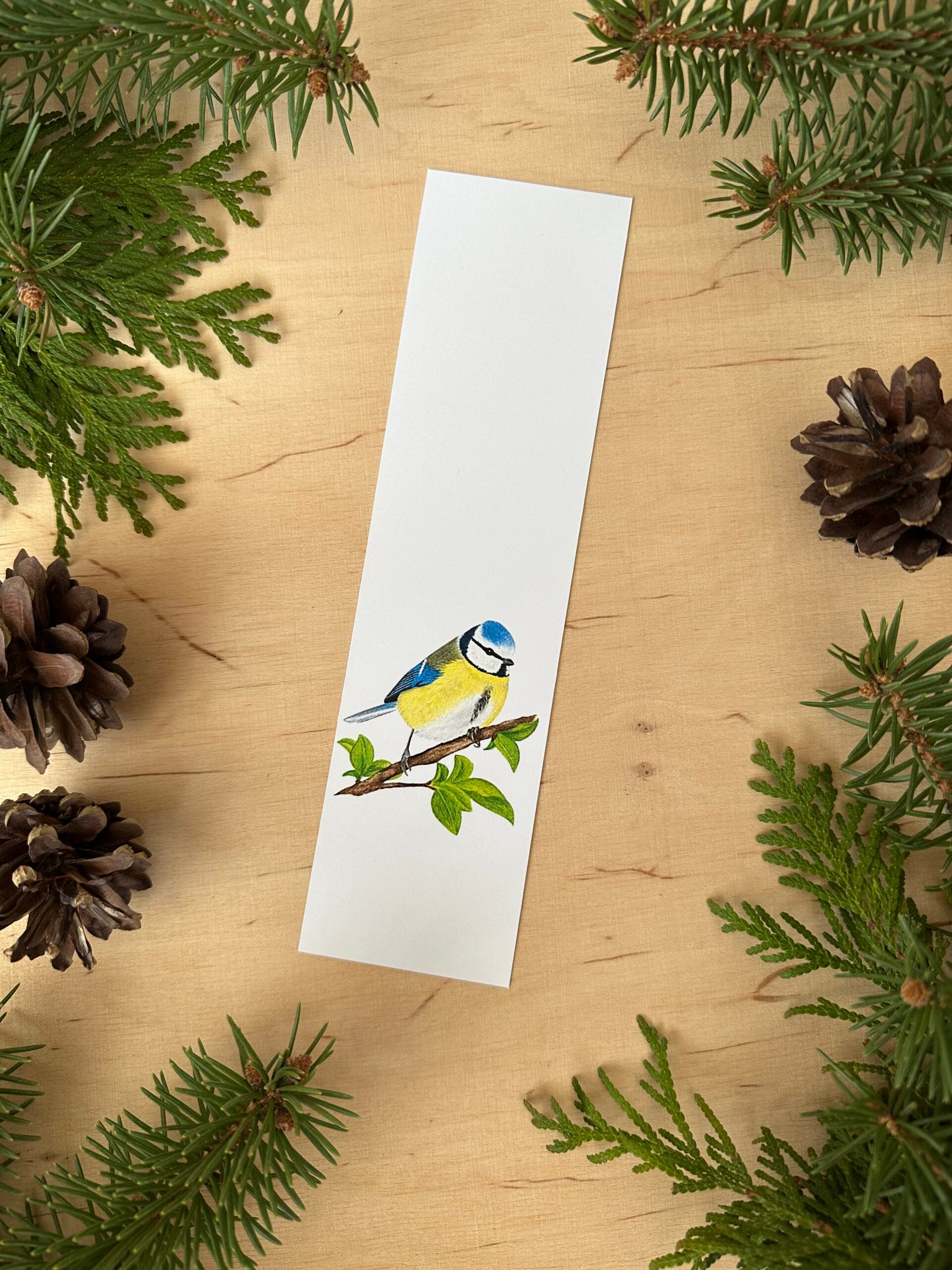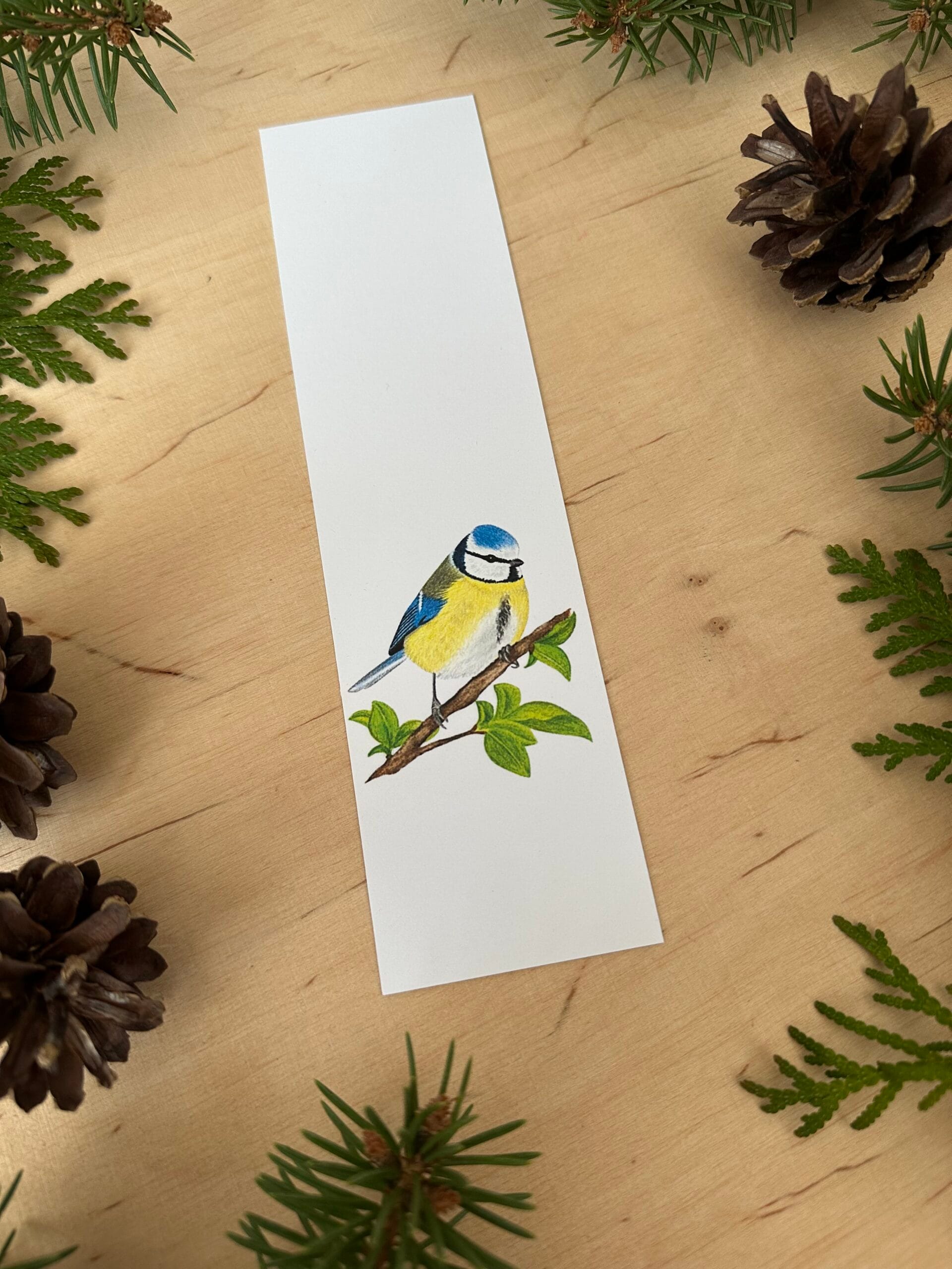 Zakładka z wydrukiem autorskiego rysunku sikorki modraszki.