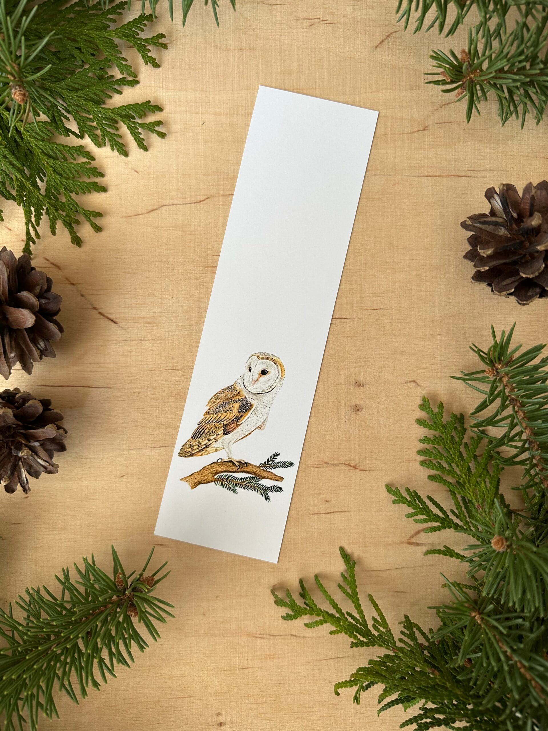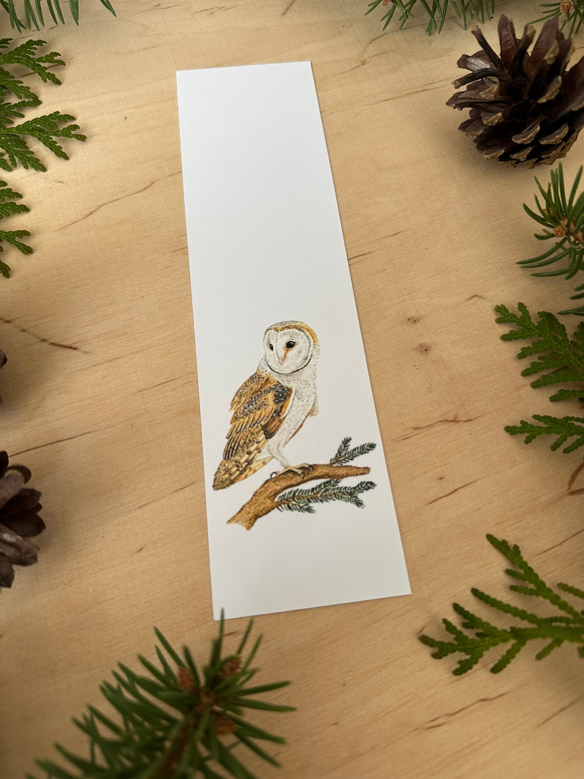 Zakładka z wydrukiem autorskiego rysunku sowy płomykówki.